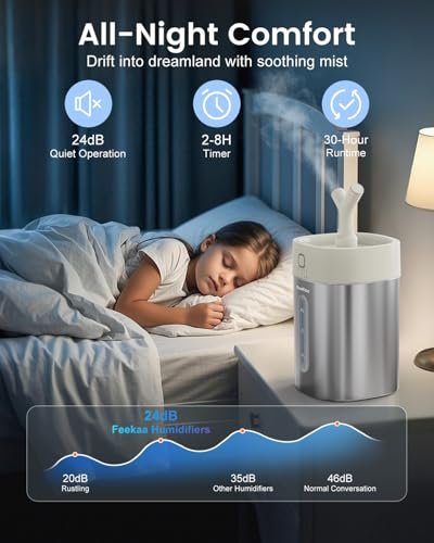 • 【Top-Fill & Safe】The leak-proof top fill design makes refilling a breeze-no need to flip or tip! Feekaa cool mist humidifiers are made from BPA-free materials. ensure that no toxic substances can leach into the water or air. and feature an automatic shut-off when water runs low. preventing any accidents. Designed with a low 24V safe voltage. minimizes the risk of electric shock and overheating. ensuring the baby humidifier operates safely.