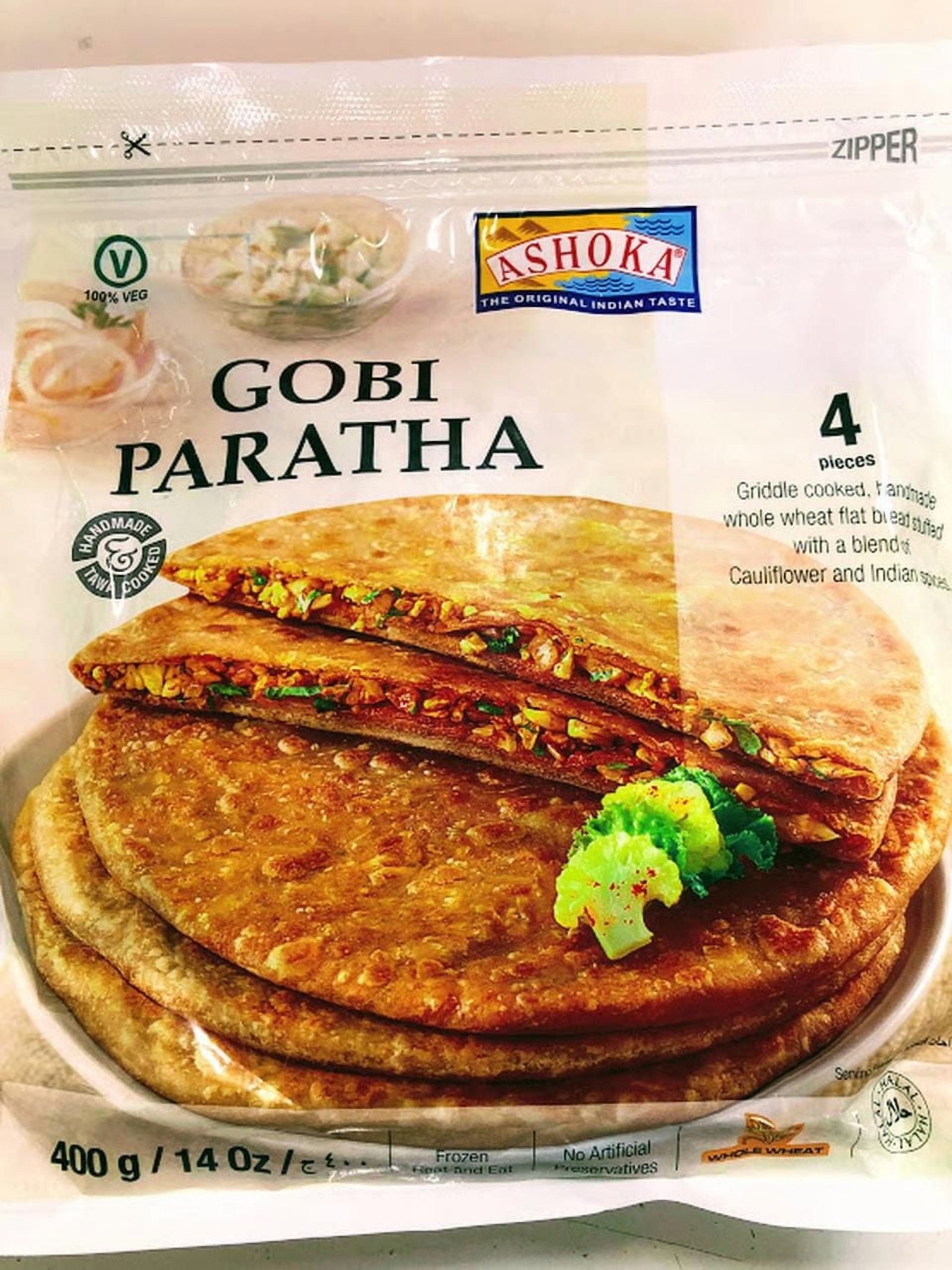 - Griddle cooked. handmade whole wheat flat bread stuffed with cauliflower and indian spices