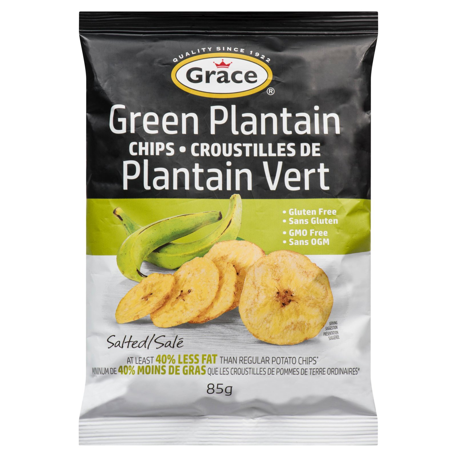 Grace green plantain chips are deliciously crunchy chips that can be eaten as an anytime snack. They are made from carefully selected flavourful green plantains. sliced and pan fried in 100 percent sunflower oil to maintain their natural flavour. Grace green plantains chips contain no preservatives. no cholesterol and no trans fat.