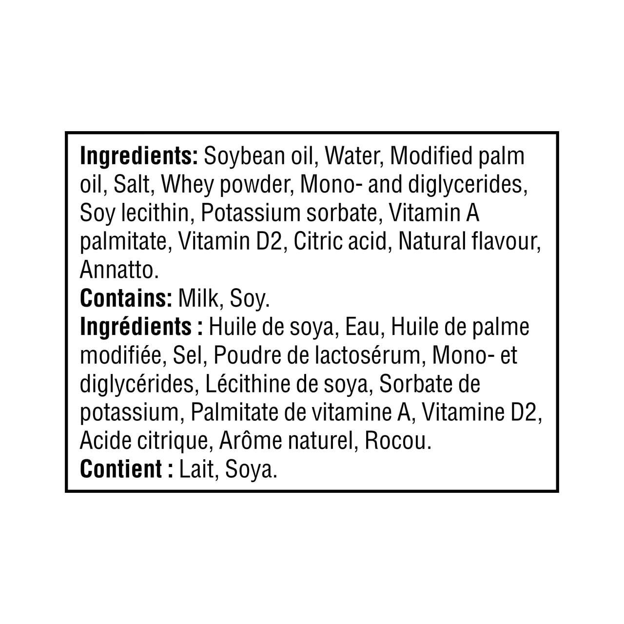 Making the switch from whole fat dairy is easy with Great Value 68% Vegetable Oil Margarine. This versatile margarine substitute for butter is a convenient choice for all of your baking and cooking needs. The soft. creamy texture spreads easily on bread. toast. pasta and roasted vegetables while adding a pinch of salty zest. Also a source of omega-3 polyunsaturates. this handy tub of 68% vegetable oil margarine keeps and stays soft in the refrigerator between servings. The Ingredient Wise symbol appears on products made without these ingredients: synthetic colours. artificial flavours and sweeteners. hydrogenated vegetable oil. monosodium glutamate. As per Canadian regulations. this product cannot contain some of these ingredients.• Creamy margarine from vegetable oil for cooking. baking. and spreading