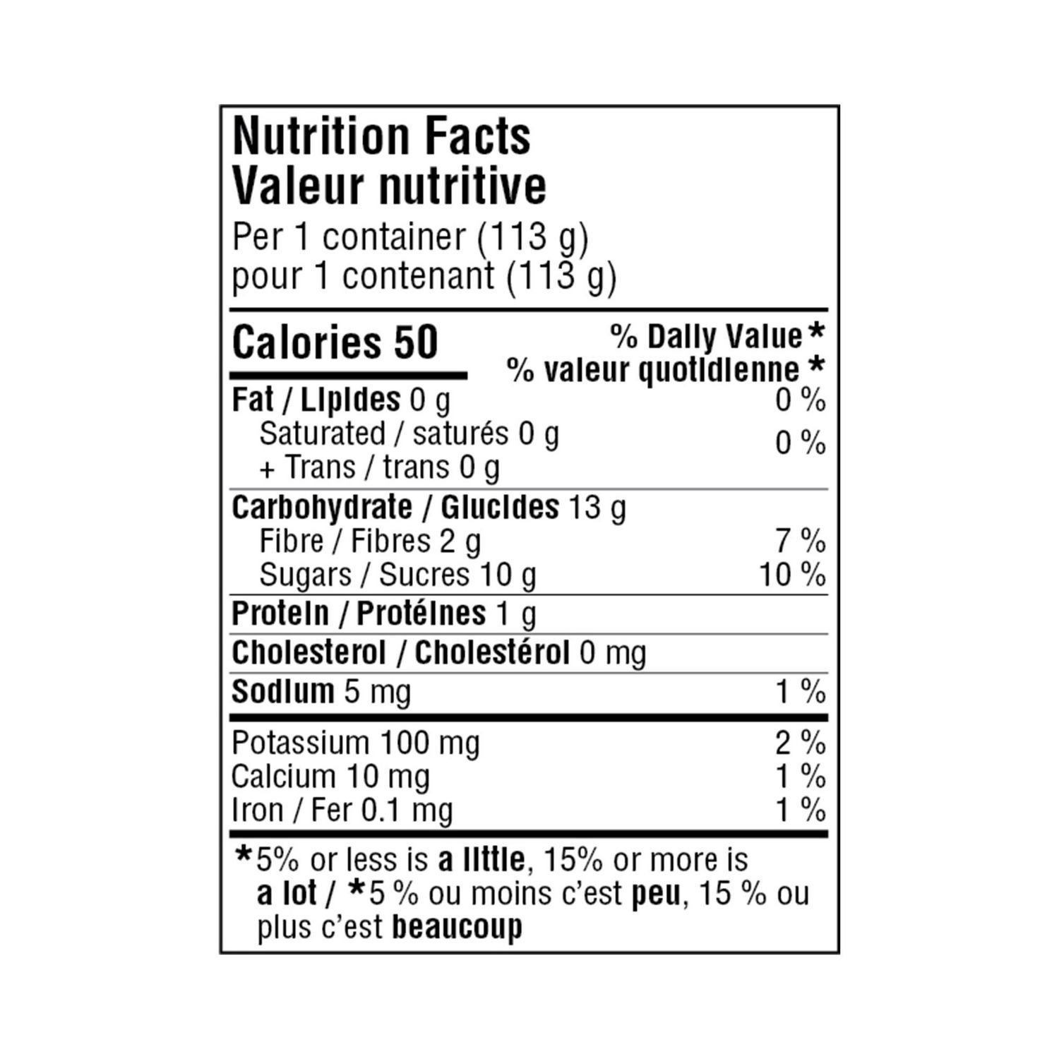 • 50 calories. 10 g of sugar. and 5 mg of sodium per 113 g container