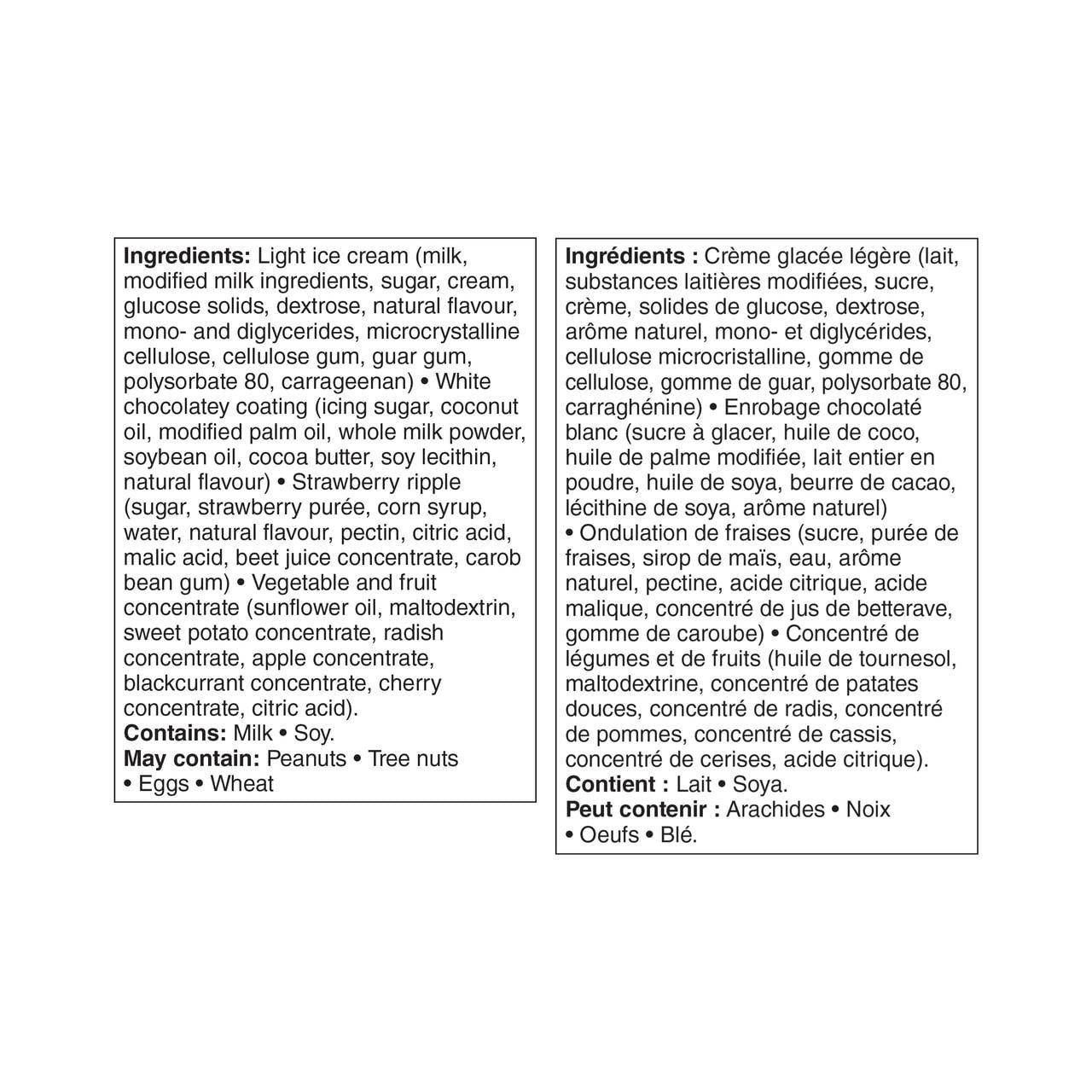 | Ingredients | Light ice cream (milk. modified milk ingredients. sugar. cream. glucose solids. dextrose. natural flavour. mono- and diglycerides. microcrystalline cellulose. cellulose gum. guar gum. polysorbate 80. carrageenan). White chocolatey coating (icing sugar. coconut oil. modified palm oil. whole milk powder. soybean oil. cocoa butter. soy lecithin. natural flavour). Strawberry ripple (sugar. strawberry purée. corn syrup. water. natural flavour. pectin. citric acid. malic acid. beet juice concentrate. carob bean gum). Vegetable and fruit concentrate (sunflower oil. maltodextrin. sweet potato concentrate. radish concentrate. apple concentrate. blackcurrant concentrate. cherry concentrate. citric acid). Contains: Milk. Soy. May contain: Peanuts. Tree nuts. Eggs. Wheat. |