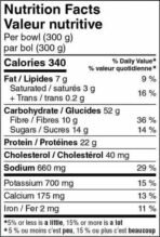 | Ingredients | Cooked red and white quinoa •Cooked brown rice •Water • Cooked chicken breast fillets (chicken breast fillet. water. modified corn starch. salt) •Black beans •Cheddar cheese •Kale •Coarse ground tomatoes in purée •Sugars (honey. pineapple juice from concentrate) •Red peppers •Onions •Tomatoes •Soy sauce (water. soybean. salt. sugar) • Apple cider vinegar •Modified corn starch •Canola oil •Red jalapeño purée (red jalapeño peppers. salt. citric acid) •Prepared yellow mustard (water. white vinegar. mustard seed. salt. spices. sugar) •Spices •Salt •Garlic powder •Onion powder •Xanthan gum •Natural flavour (smoke flavour. natural flavour). Contains: Milk •Soy •Mustard. May contain: Tree nuts • Sesame •Eggs •Fish •Crustaceans •Shellfish •Sulphites. |