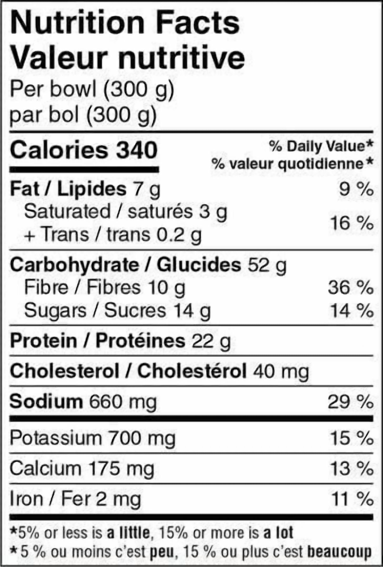 | Ingredients | Cooked red and white quinoa •Cooked brown rice •Water • Cooked chicken breast fillets (chicken breast fillet. water. modified corn starch. salt) •Black beans •Cheddar cheese •Kale •Coarse ground tomatoes in purée •Sugars (honey. pineapple juice from concentrate) •Red peppers •Onions •Tomatoes •Soy sauce (water. soybean. salt. sugar) • Apple cider vinegar •Modified corn starch •Canola oil •Red jalapeño purée (red jalapeño peppers. salt. citric acid) •Prepared yellow mustard (water. white vinegar. mustard seed. salt. spices. sugar) •Spices •Salt •Garlic powder •Onion powder •Xanthan gum •Natural flavour (smoke flavour. natural flavour). Contains: Milk •Soy •Mustard. May contain: Tree nuts • Sesame •Eggs •Fish •Crustaceans •Shellfish •Sulphites. |