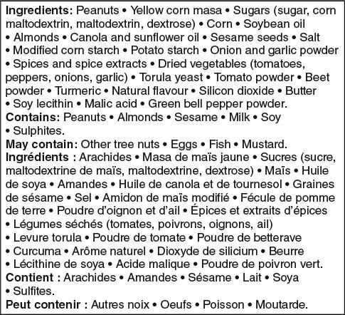 Mix up your routine and satisfy a snack attack with the Great Value™ Cajun Trail Mix. Every handful features a tasty medley of cajun flavoured peanuts. butter toffee peanuts and almonds. cajun corn sticks. sesame sticks and BBQ corn nuts. Whether you’re on the go or snacking at home. it’s a seriously crunchy balance of savoury and sweet—all free from gluten. artificial flavours and colours—that will have you reaching for more.