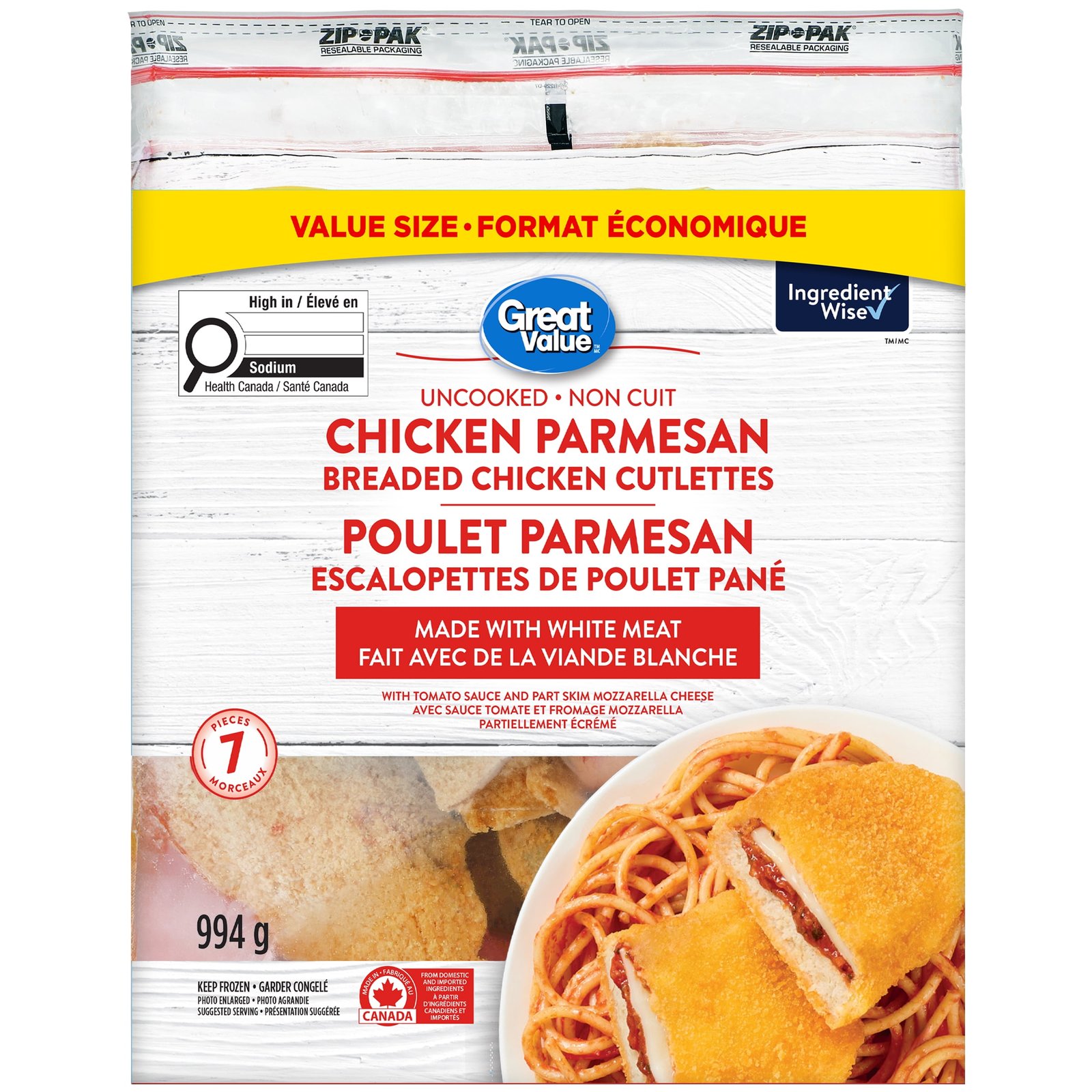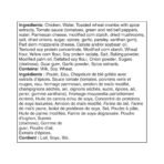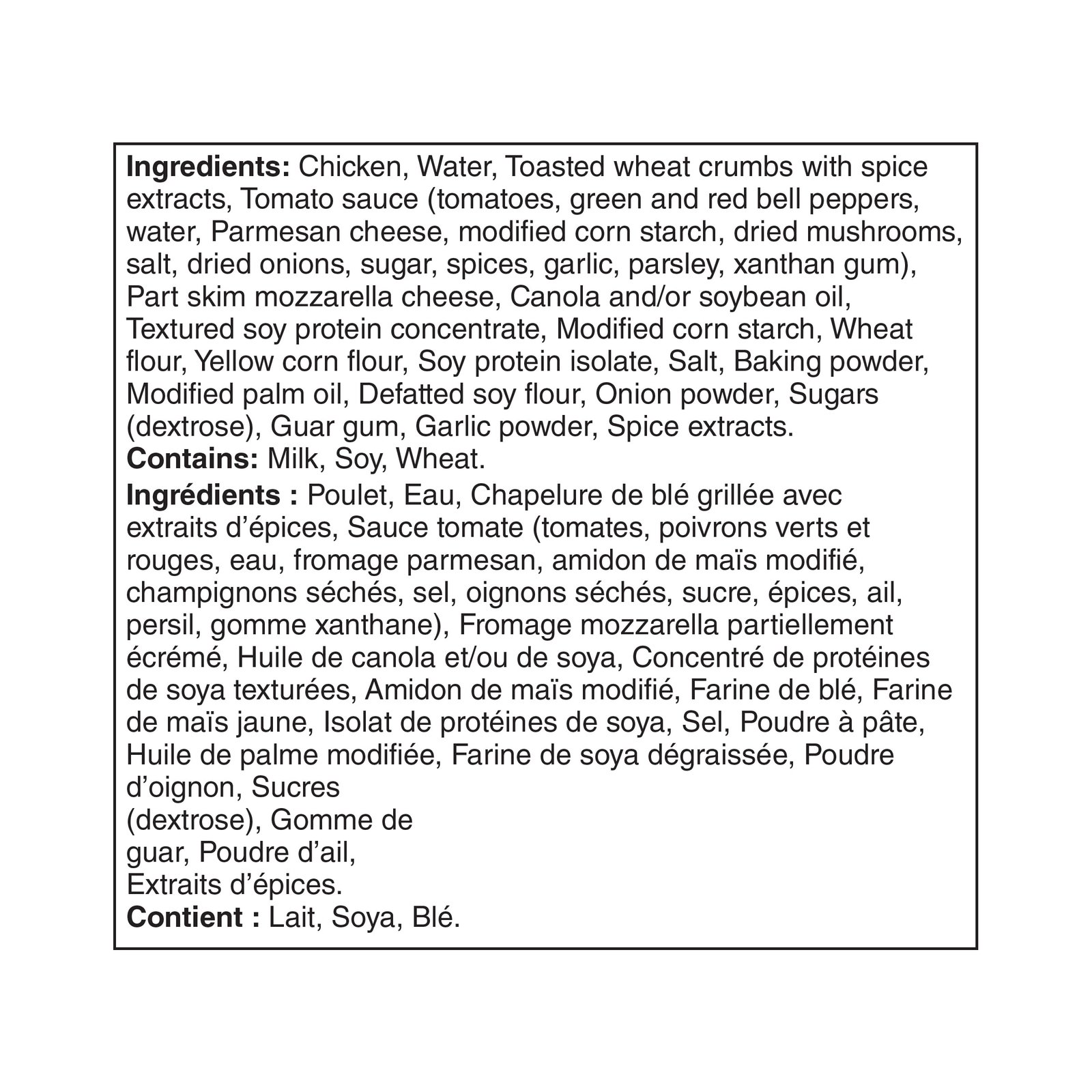| Ingredients | Chicken. Water. Toasted wheat crumbs with spice extracts. Tomato sauce (tomatoes. green and red bell peppers. water. Parmesan cheese. modified corn starch. dried mushrooms. salt. dried onions. sugar. spices. garlic. parsley. xanthan gum). Part skim mozzarella cheese. Canola and/or soybean oil. Textured soy protein concentrate. Modified com starch. Wheat flour. Yellow corn flour. Soy protein isolate. Salt. Baking powder. Modified palm oil. Defatted soy flour. Onion powder. Sugars (dextrose). Guar gum. Garlic powder. Spice extracts. Contains: Mik. Soy. Wheat. |