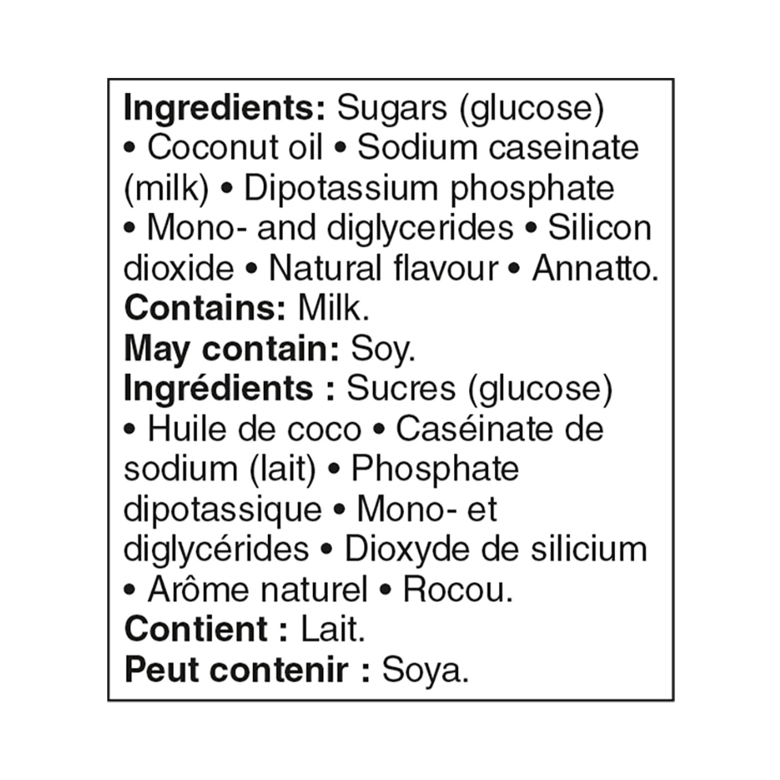| Fabric Property | • Rich and creamy whitener for coffee. tea. hot chocolate. and more • Lactose free • Screw-on top helps keep moisture out • Store in a cool. dry place • An Ingredient Wise product • Caution: Like many powdered products. do not store near open flame or high heat source |