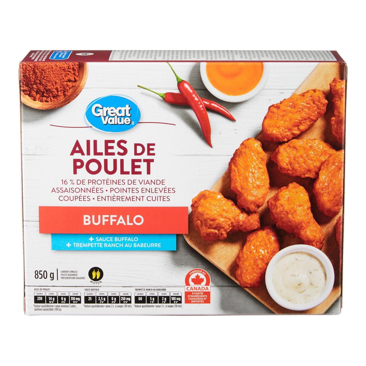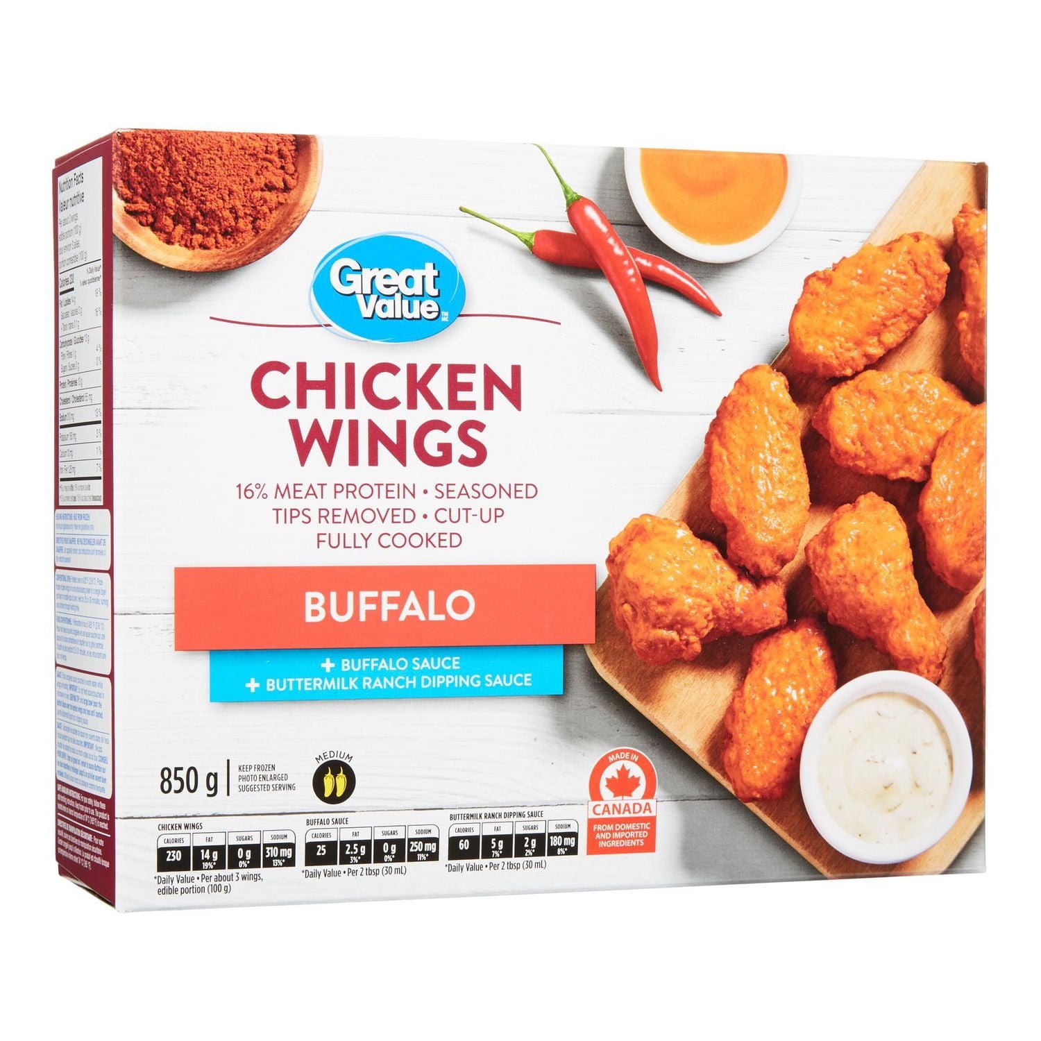 Dig into pub-style wings with Great Value Buffalo Chicken Wings. These lightly coated winglets and drumettes are dusted in spice. and cook in 30 minutes. Toss them in Buffalo sauce. then serve with Buttermilk Ranch dip (both included). Yum!