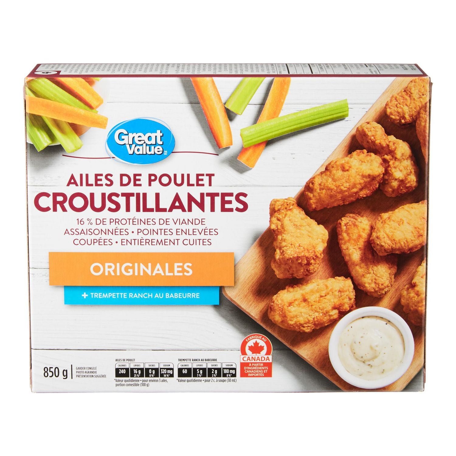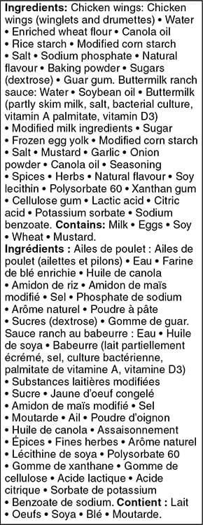 | Ingredients | Chicken wings: Chicken wings (winglets and drumettes) . Water . Enriched wheat flour Canola oil . Rice Starch .Modified corn starch .Salt .Sodium phosphate .Natural flavour .Baking powder .Sugars (dextrose) .Guar gum. Buttermilk ranch sauce: Water .Soybean oil .Buttermilk (partly skim milk. salt. bacterial culture. vitamin A palmitate. Vitamin D3) . Modified milk ingredients . Sugar . Frozen egg yolk . Modified corn starch . Salt . Mustard . Garlic . Onion powder . Canola oil . Seasoning . Spices . Herbs . Natural flavour . Soy lecithin . Polysorbate 60 . Xanthan gum .Cellulose gum . Lactic acid . Citric acid . Potassium sorbate . Sodium benzoate. Contains: Milk . Eggs . Soy . Wheat . Mustard |