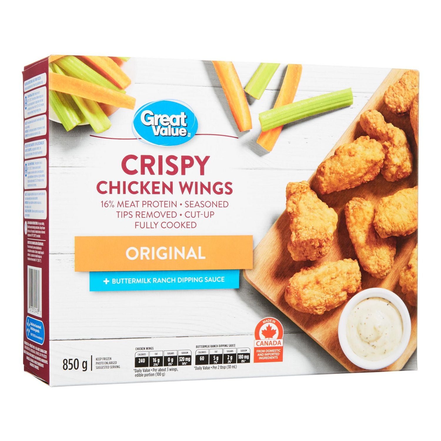 Any night is wing night with Great Value Original Crispy Chicken Wings. These crispy. lightly coated winglets and drumettes are ready to enjoy in 30 minutes. Just heat. serve. dip and devour – each box includes Buttermilk Ranch dipping sauce.