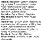 | Ingredients | Beef. water. textured soy protein. toasted wheat crumbs. salt. dehydrated onion. spices. dehydrated garlic. grill and smoke flavours. caramel colour. Contains: soy. wheat. sulphites. May contain: sesame. milk. eggs. mustard. |