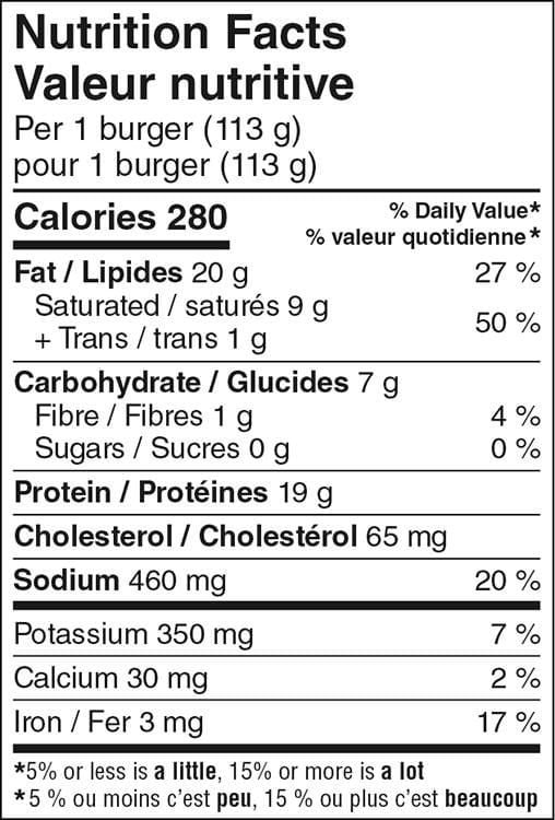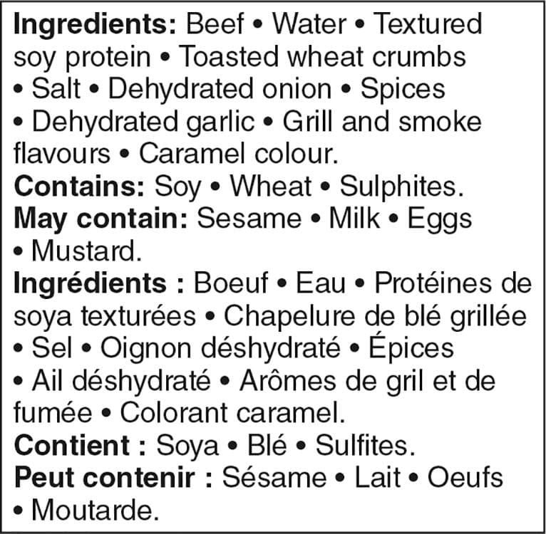| Ingredients | Beef. water. textured soy protein. toasted wheat crumbs. salt. dehydrated onion. spices. dehydrated garlic. grill and smoke flavours. caramel colour. Contains: soy. wheat. sulphites. May contain: sesame. milk. eggs. mustard. |