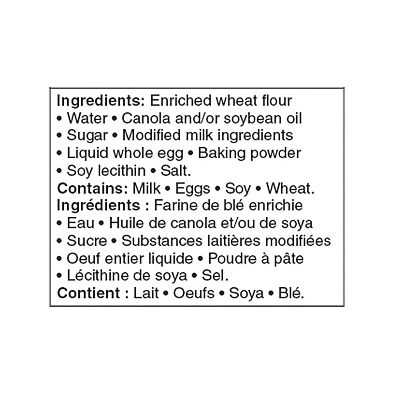 | Ingredients | Enriched wheat flour • Water • Canola and/or soybean oil • Sugar • Modified milk ingredients • Liquid whole egg • Baking powder • Soy lecithin • Salt.Contains: Milk • Eggs • Soy • Wheat. |