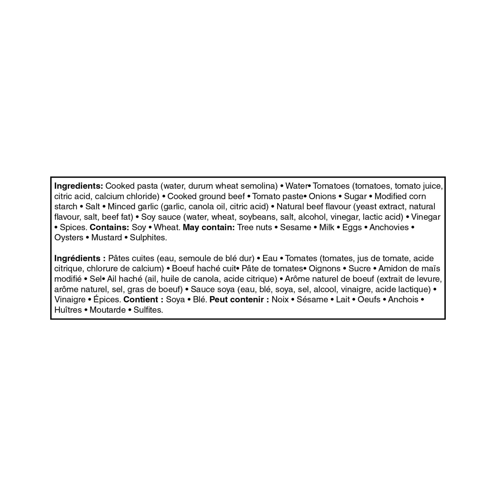 | Ingredients | Ingredients: Cooked pasta (water. durum wheat semolina). Water. Tomatoes (tomatoes. tomato juice. citric acid. calcium chloride). Cooked ground beef. Tomato paste. Onions. Sugar. Modified corn starch. Salt. Minced garlic (garlic. canola oil. citric acid). Natural beef flavour (yeast extract. natural flavour. salt. beef fat). Soy sauce (water. wheat. soybeans. salt. alcohol. vinegar. lactic acid). Vinegar. Spices. Contains: Soy. Wheat May contain: Tree nuts. Sesame. Milk. Eggs. Anchovies. Oysters. Mustard. Sulphites |