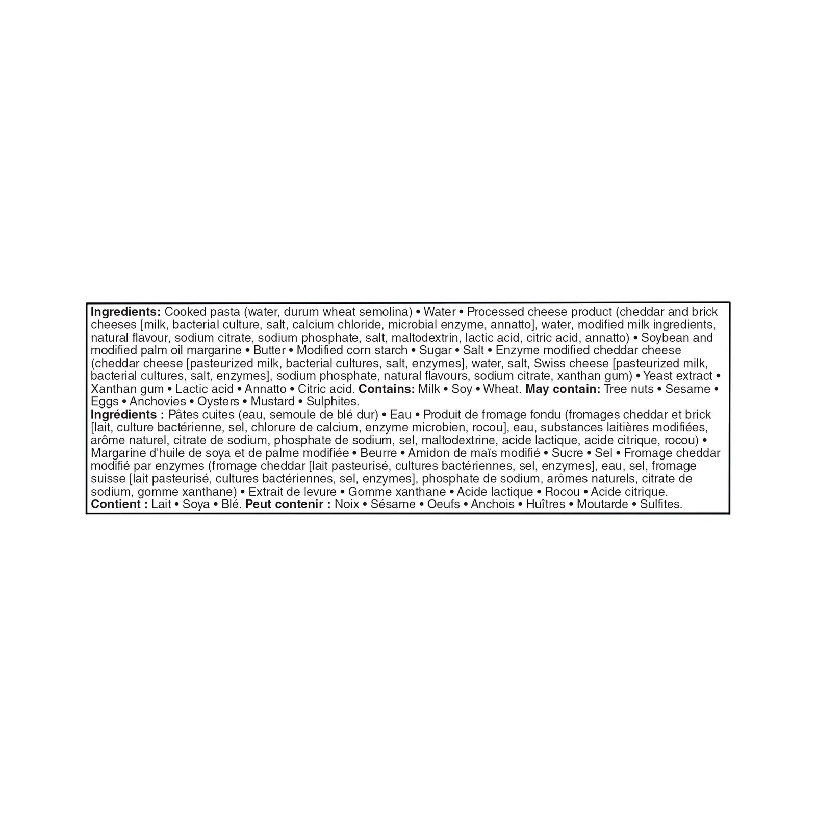 IngredientsIngredients: Cooked pasta (water. durum wheat semolina). Water. Broccoli. Carrots. Red peppers. Soy sauce (water. wheat. soybeans. salt. alcohol. vinegar. lactic acid). Sugars (sugar. pineapple juice concentrate). Onions. Modified corn starch. Sesame oil. Vegetable base (cooked vegetables [carrots. onions. celery]. salt. sugar. corn oil. potato flour. carrot powder). Yeast extract. Ginger purée (ginger. water). Garlic purée (garlic. water). Salt. Xanthan gum. Natural flavour. Contains: Sesame. Soy. Wheat May contain: Tree nuts. Milk. Eggs. Anchovies. Oysters. Mustard. Sulphites