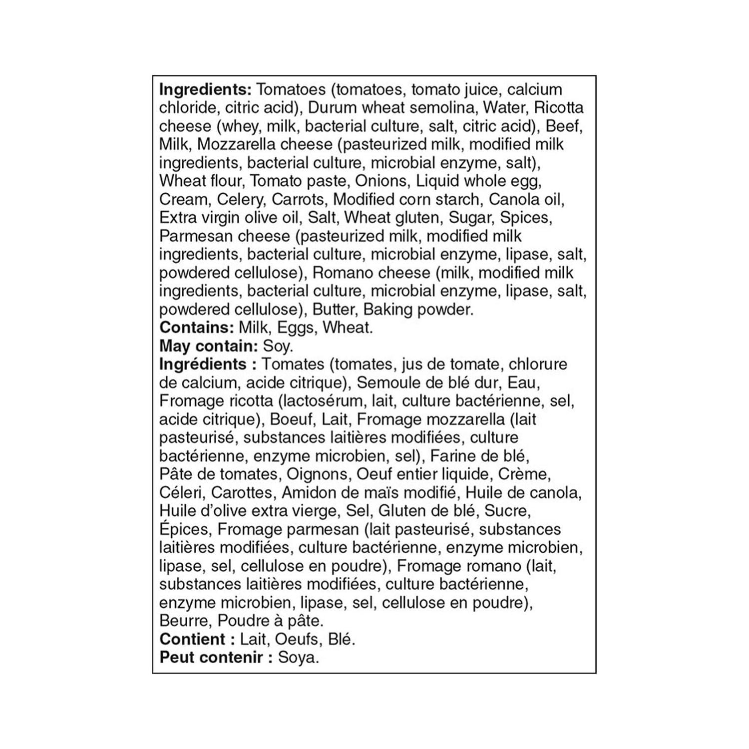 IngredientsTomatoes (tomatoes. tomato juice. calcium chloride. citric acid). Durum wheat semolina. Water. Ricotta cheese (whey. milk. bacterial culture. salt. citric acid). Beef. Milk. Mozzarella cheese (pasteurized milk. modified milk ingredients. bacterial culture. microbial enzyme. salt). Wheat flour. Tomato paste. Onions. Liquid whole egg. Cream. Celery. Carrots. Modified corn starch. Canola oil. Extra virgin olive oil. Salt. Wheat gluten. Sugar. Spices. Parmesan cheese (pasteurized milk. modified milk ingredients. bacterial culture. microbial enzyme. lipase. salt. powdered cellulose). Romano cheese (milk. modified milk ingredients. bacterial culture. microbial enzyme. lipase. salt. powdered cellulose). Butter. Baking powder.Contains: Milk. Eggs. Wheat.May contain: Soy.