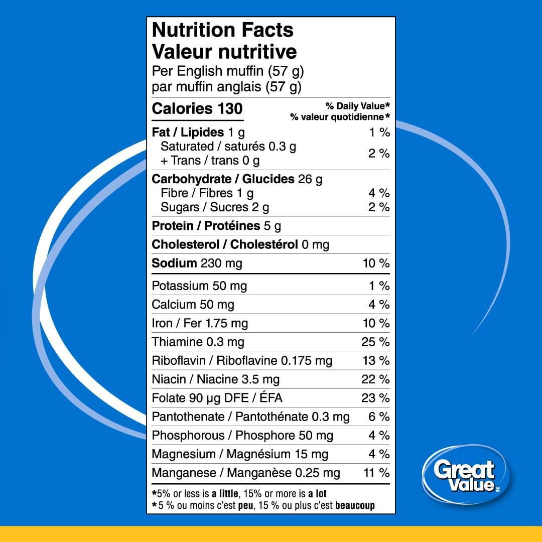 The Ingredient Wise™ symbol appears on Great Value™ products made without these ingredients: synthetic colours. artificial flavours and sweeteners. hydrogenated vegetable oil. monosodium glutamate.• 6 english muffins • Source of 6 essential nutrients