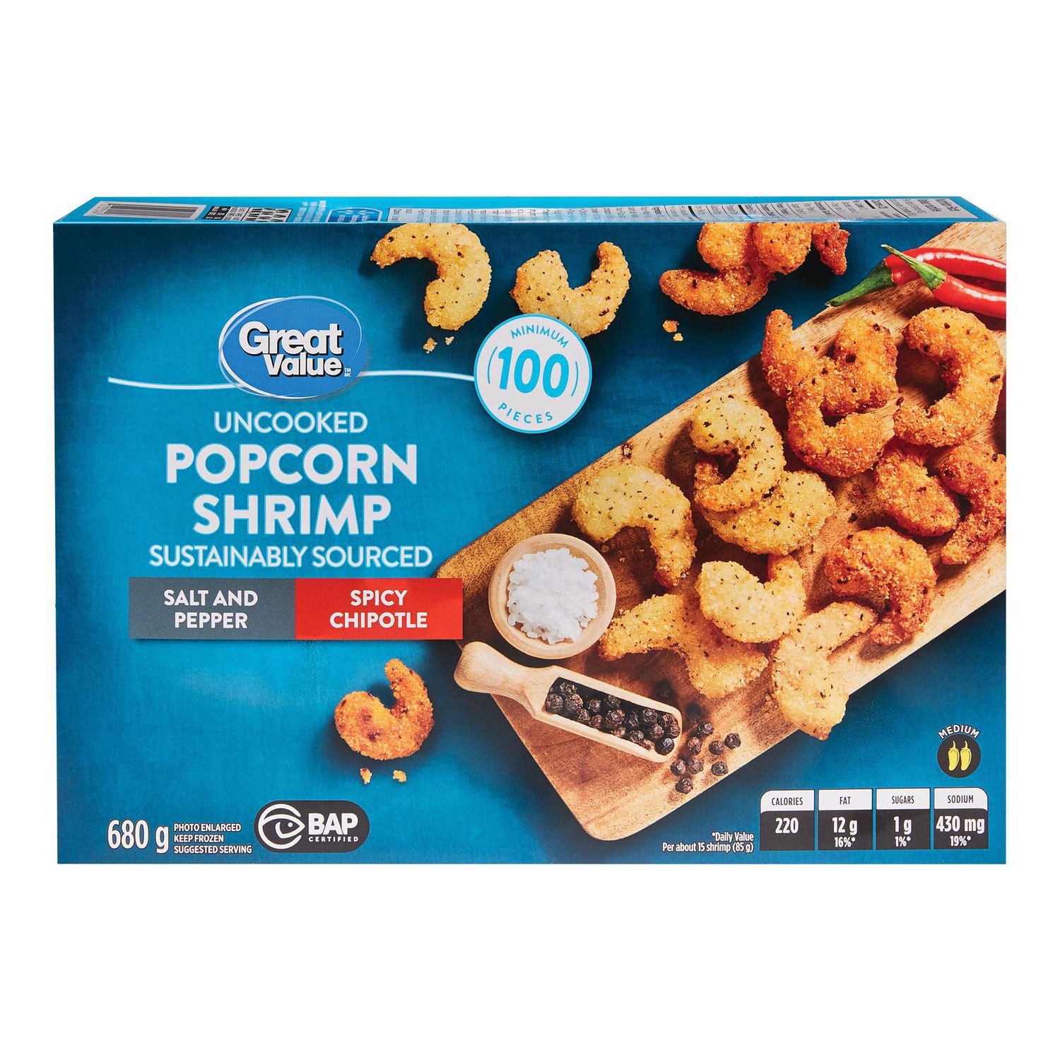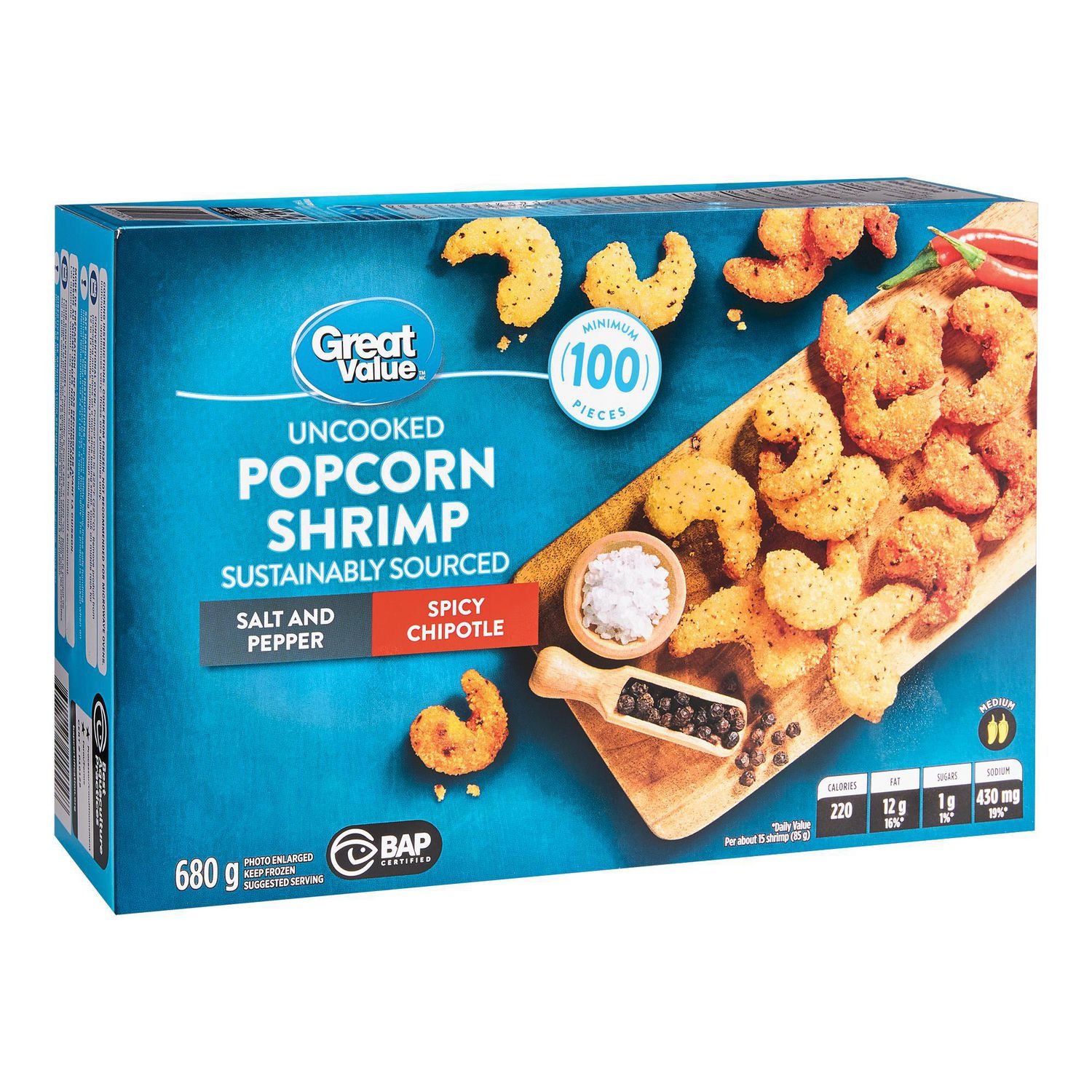 There’s two kinds of deliciousness in every pack of Great Value™ Popcorn Shrimp. Why choose between savoury salt & pepper or spicy chipotle. when you can have both? With a minimum of 100 pieces per box. these bite-sized breaded shrimp are delicious on their own or dipped in your favourite sauce.