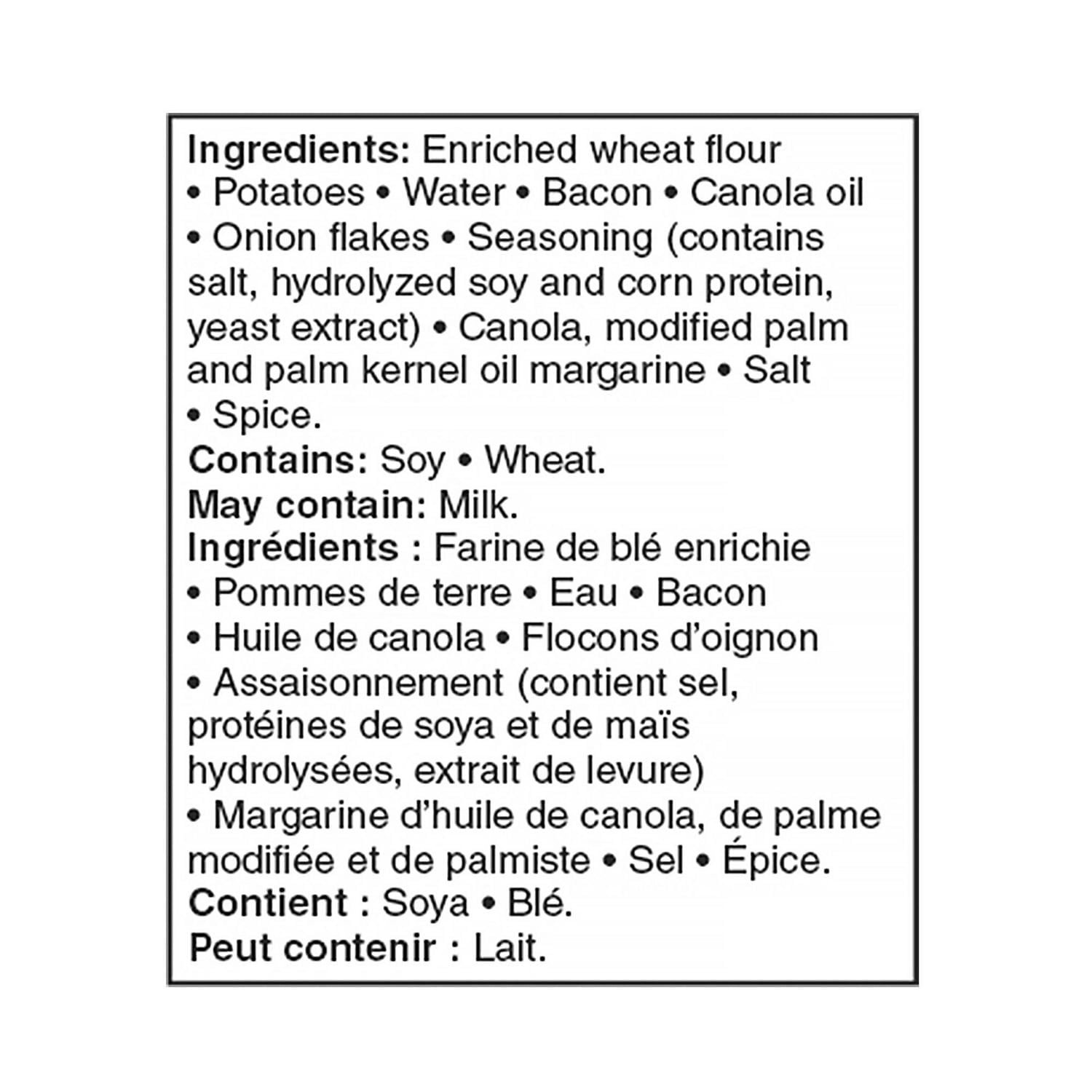 | Ingredients | Enriched wheat flour. Potatoes. Water. Bacon. Canola oil. Onion flakes. Seasoning (contains salt. hydrolyzed soy and corn protein. yeast extract). Canola. modified palm and palm kernel oil margarine. Salt. Spice.Contains: Soy. wheat.May contain: Milk. |