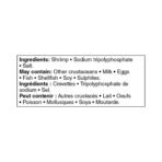 | Ingredients | Shrimp. Sodium tripolyphosphate. Salt. May contain: Other crustaceans. Milk. Eggs. Fish. Shellfish. Soy. Sulphites. |