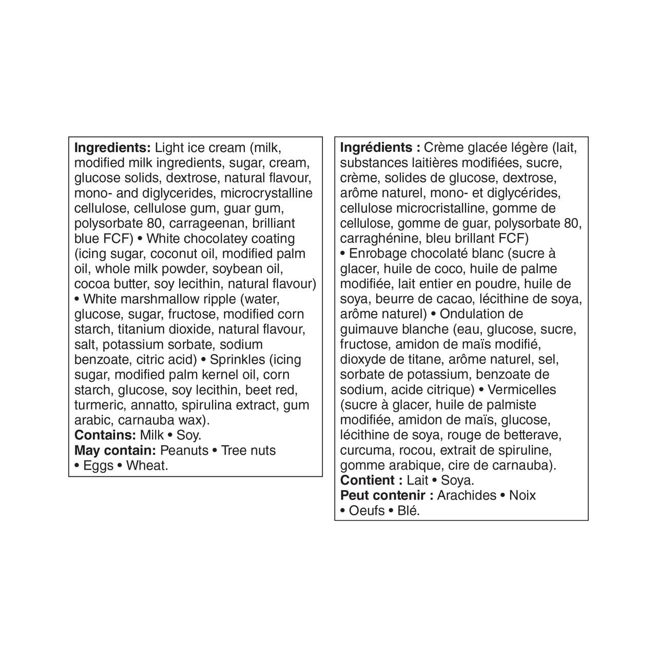 | Ingredients | Light ice cream (milk. modified milk ingredients. sugar. cream. glucose solids. dextrose. natural flavour. mono- and diglycerides. microcrystalline cellulose. cellulose gum. guar gum. polysorbate 80. carrageenan. brilliant blue FCF). White chocolatey coating (icing sugar. coconut oil. modified palm oil. whole milk powder. soybean oil. cocoa butter. soy lecithin. natural flavour). White marshmallow ripple (water. glucose. sugar. fructose. modified corn starch. titanium dioxide. natural flavour. salt. potassium sorbate. sodium benzoate. citric acid). Sprinkles (icing sugar. modified palm kernel oil. corn starch. glucose. soy lecithin. beet red. turmeric. annatto. spirulina extract. gum arabic. carnauba wax). Contains: Milk. Soy. May contain: Peanuts. Tree nuts. Eggs. Wheat. |