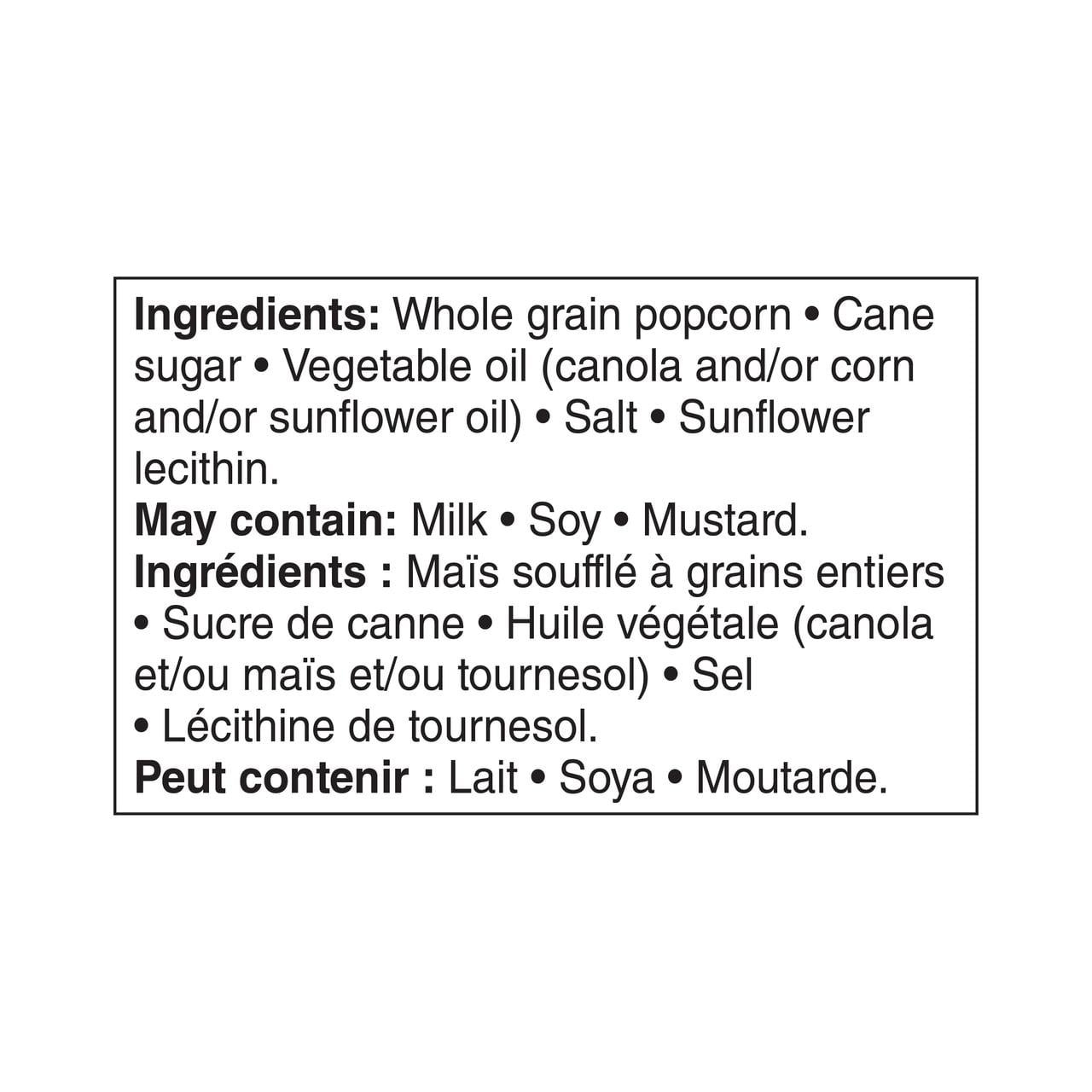 Thrill your taste buds with the dual delight of Great Value Sweet & Salty Kettle Corn. Both flavours shine through in this pre-popped and seasoned kettle corn that’s sure to please all popcorn lovers. The ideal gametime snack or casual nosh. it’s a source of dietary fibre and made with 100% whole grain corn. Pack a bag for your next road trip or mix this flavoured popcorn with pretzel rings. peanuts. and more for a deluxe party treat. The Ingredient Wise symbol appears on products made without these ingredients: synthetic colours. artificial flavours and sweeteners. hydrogenated vegetable oil. monosodium glutamate.• Whole grain popcorn snack