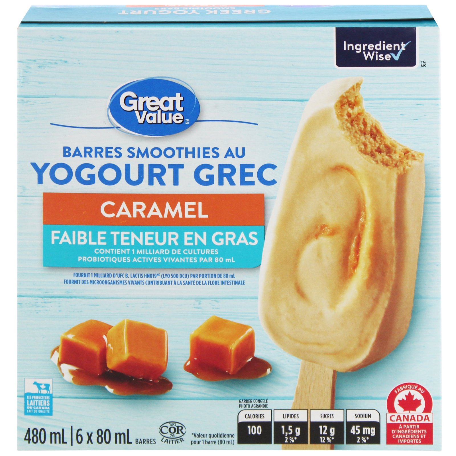 | Ingredients | Milk. Water. Sugar. Caramel ripple (Sweetened condensed milk. Sugar. Water. Glucose. Coconut oil. Brown sugar. Salt. Natural flavour. Sodium citrate. Carrageenan. Soy lecithin). Modified milk ingredients. Glucose solids. Skim milk powder. Cream. Natural caramel Flavour. Caramel colour. Carob Bean gum. Guar gum. Active bacterial culture (S. Thermophilus. l. Bulgaricus. B. Lactis HN019 [LYO 500DCU]). Carrageenan. Contains: Milk. Soy. May contain: Peanuts. Tree nuts. Eggs. Wheat. Provides 1 billion B. Lactis HN019 (LYO 500 DCU) CFU per 80 mL serving. Provides live microorganisms that contribute to healthy gut flora. |