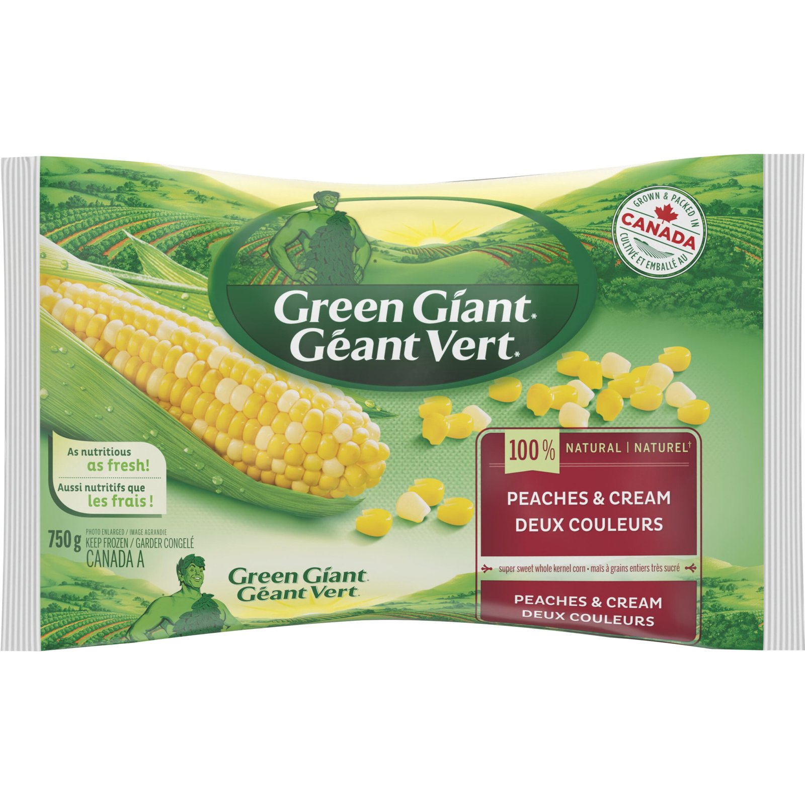 Green Giant’s iconic white and yellow. Peaches & Cream corn is Picked at the Peak of PerfectionTM then flash frozen for road-side level corn all year round.