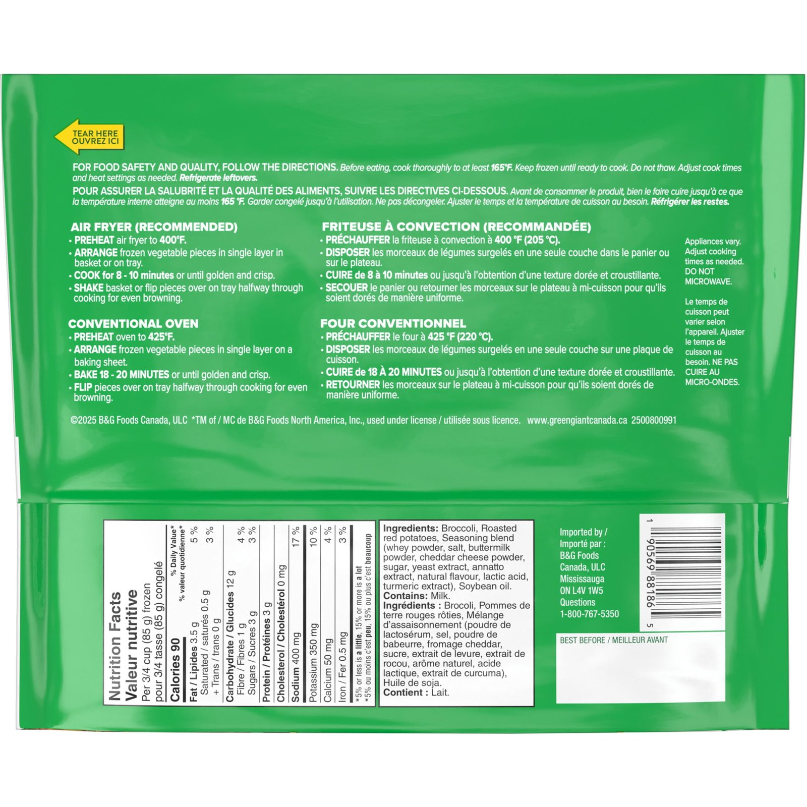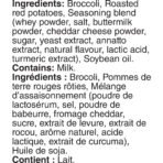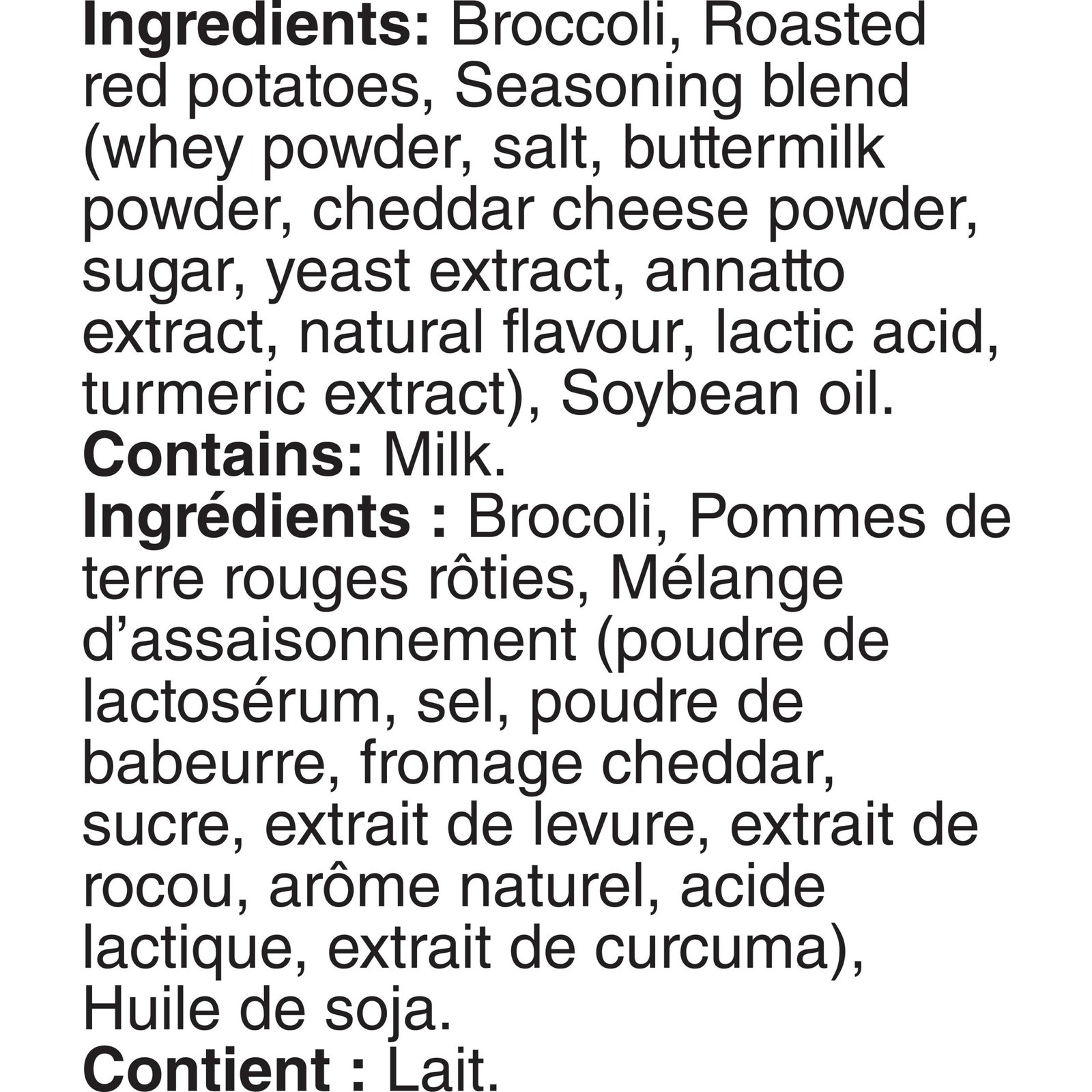 | Ingredients | Broccoli. Roasted red potatoes. Seasoning blend (whey powder. salt. buttermilk powder. cheddar cheese powder. sugar. yeast extract. annatto extract. natural flavour. lactic acid. turmeric extract). Soybean oil. Contains: Milk. |