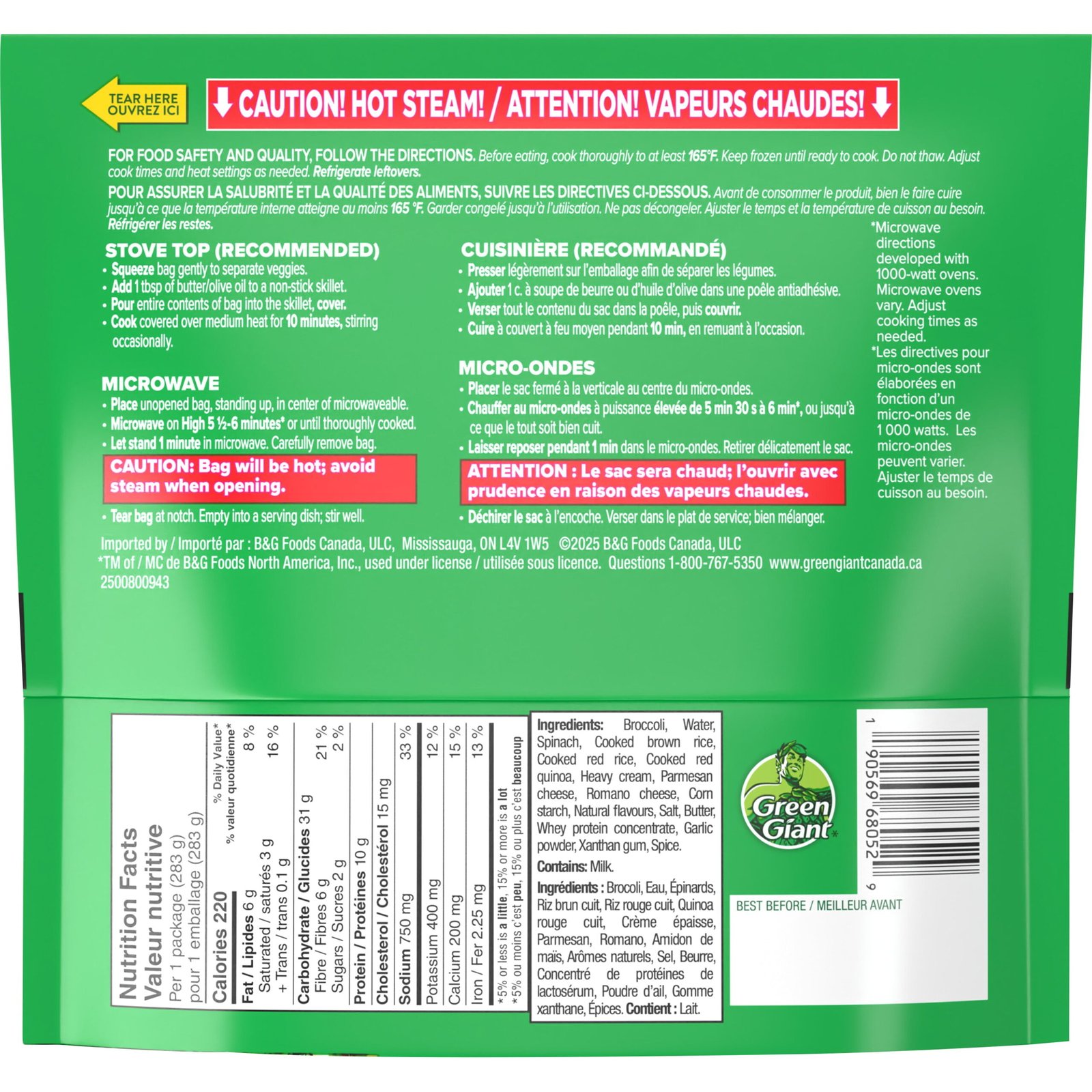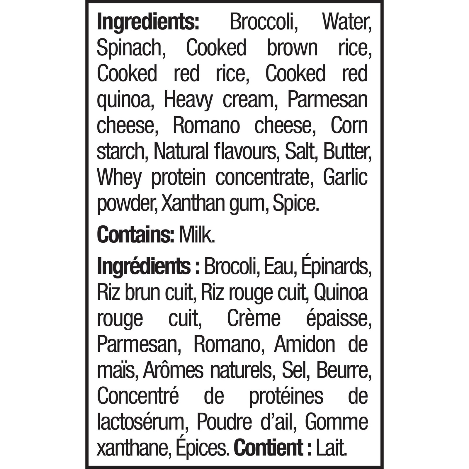 IngredientsBroccoli. Water. Spinach. Cooked brown rice. Cooked red rice. Cooked red quinoa. Heavy cream. Parmesan cheese. Romano cheese. Corn starch. Natural flavours. Salt. Butter. Whey protein concentrate. Garlic powder. Xanthan gum. Spice. Contains: Milk.