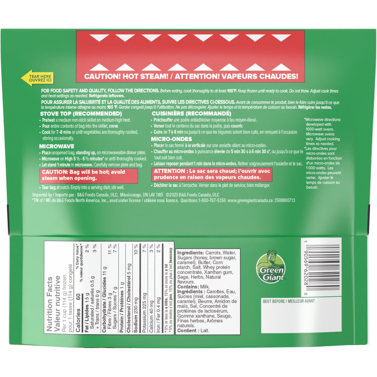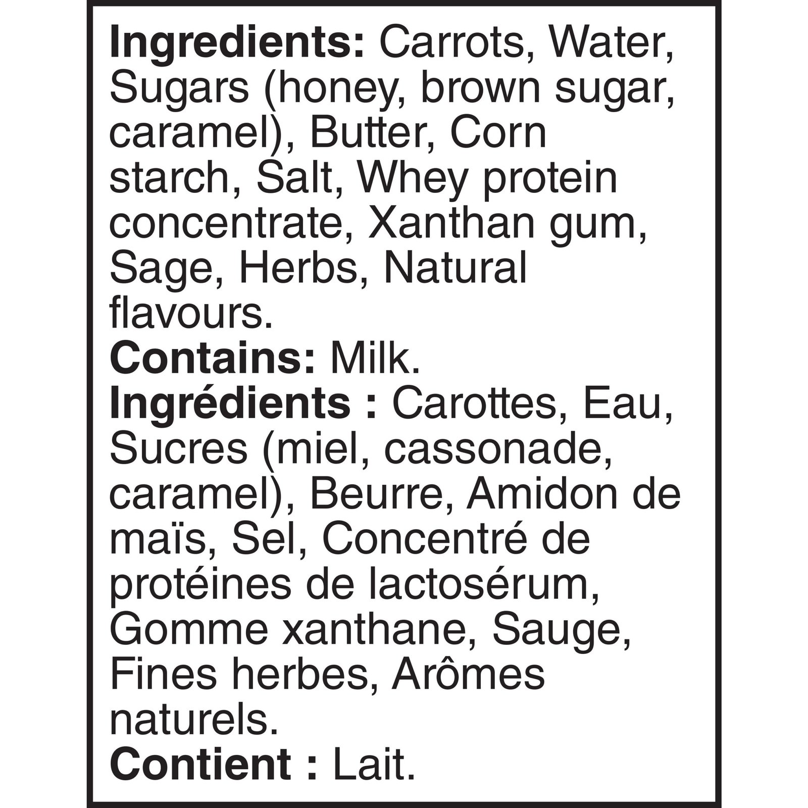 | Ingredients | Carrots. Water. Sugars (honey. brown sugar. caramel). Butter. Corn starch. Salt. Whey protein concentrate. Xanthan gum. Sage. Herbs. Natural flavours. Contains: Milk. |