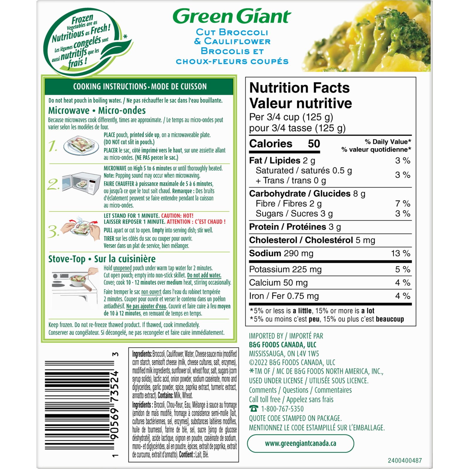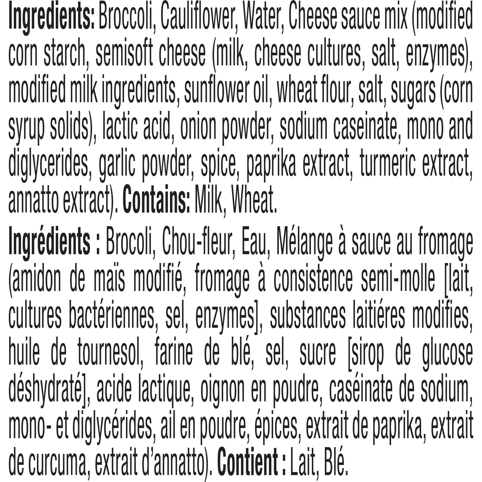 | Ingredients | Broccoli. Cauliflower. Water. Cheese Sauce Mix [Modified Corn Starch. Semisoft Cheese (Pasteurized Milk. Bacterial Cultures. Salt. Microbial Enzymes). Modified Milk Ingredients. Sunflower Oil. Wheat Flour. Salt. Corn Syrup Solids. Lactic Acid. Onion Powder. Sodium Caseinate. Mono and Diglycerides. Garlic Powder. Spice. Colour]. Contains Milk and Wheat. |