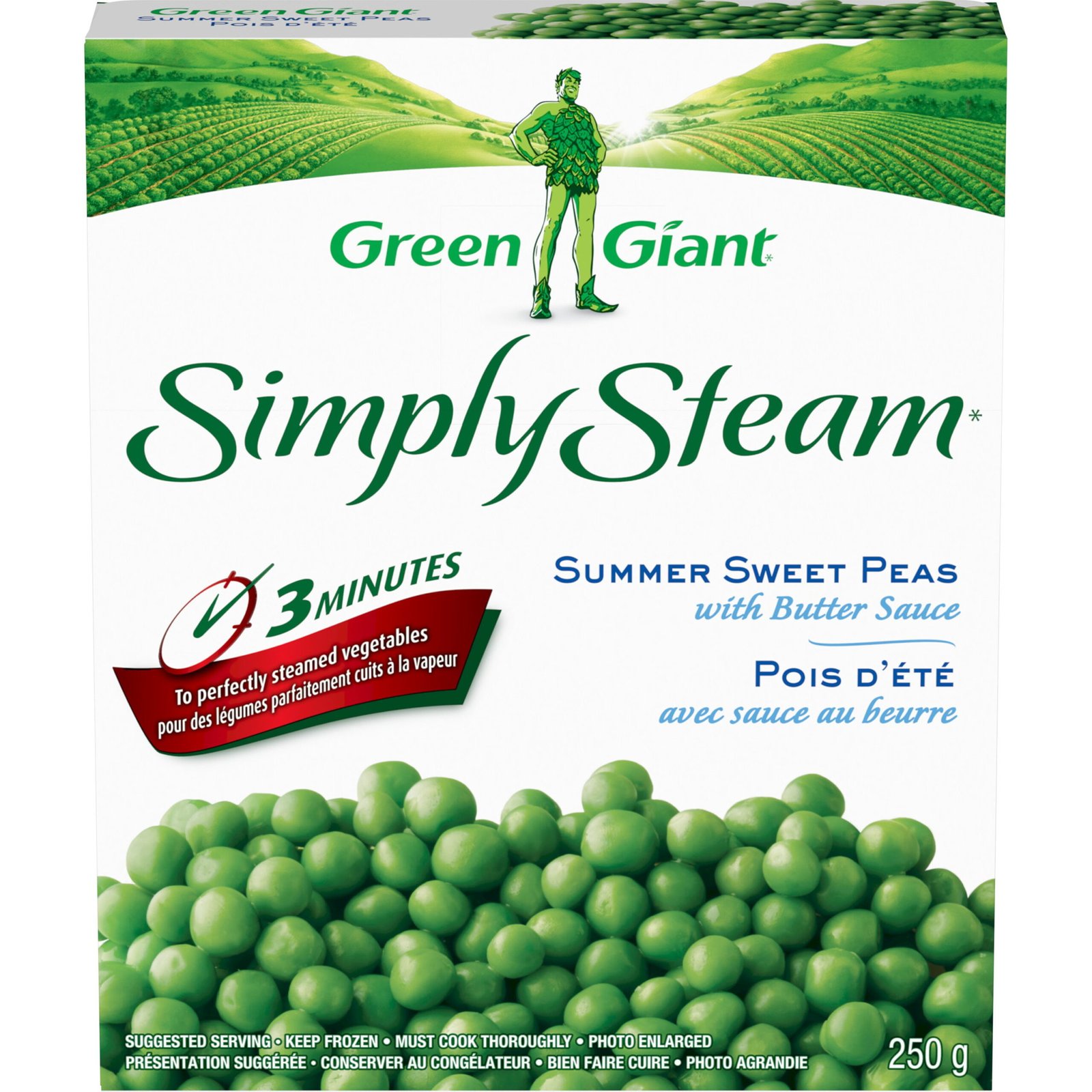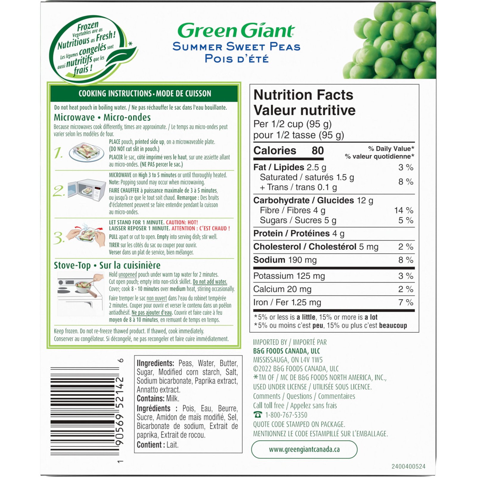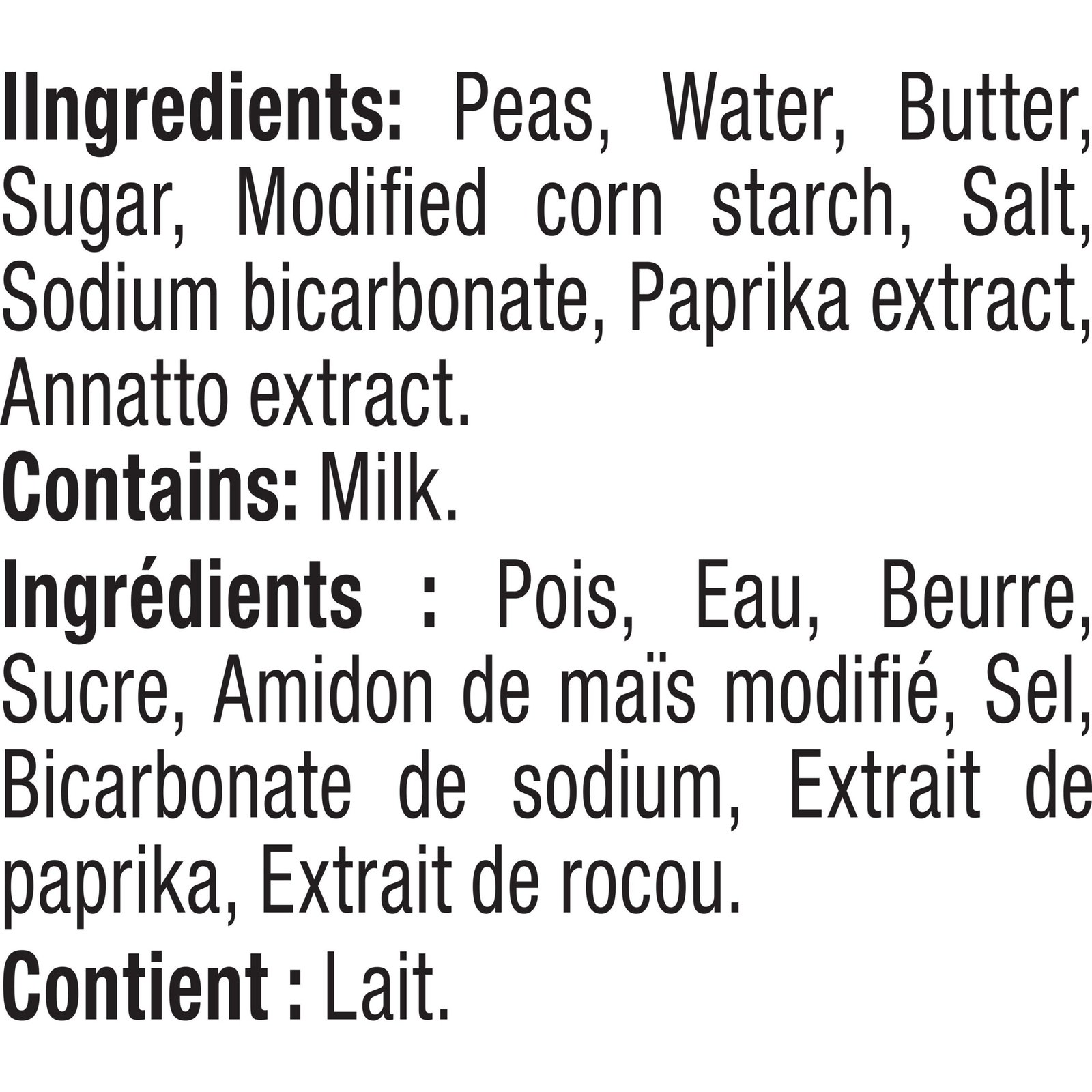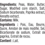 | Ingredients | Peas. Water. Butter. Sugar. Modified Corn Starch. Salt. Sodium Bicarbonate. Contains Milk Ingredients. |