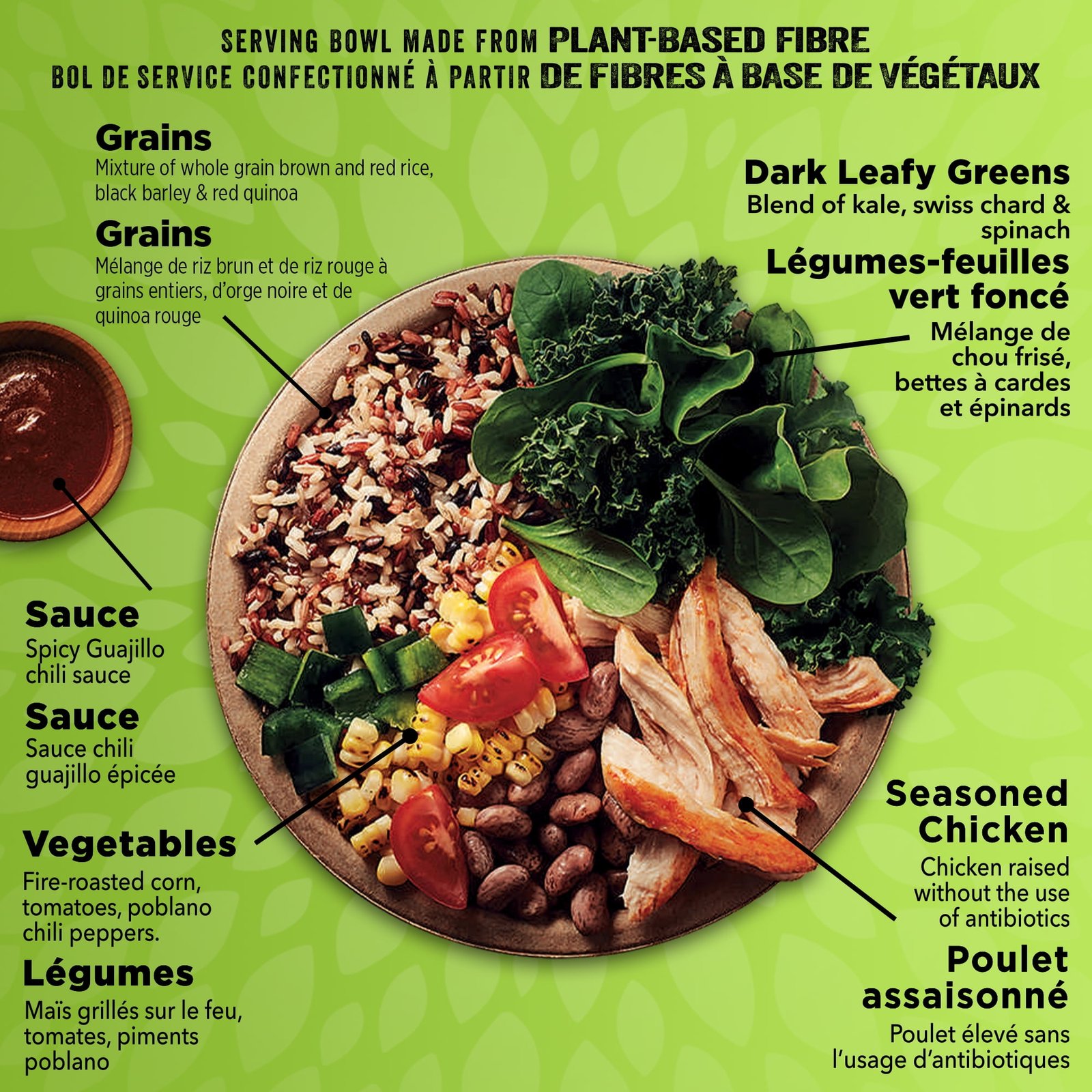 | Ingredients | SEASONED COOKED CHICKEN (CHICKEN BREAST. WATER. OLIVE OIL. BROWN SUGAR. SEA SALT. SPICE EXTRACTS). COOKED BROWN RICE (WATER. BROWN RICE). WATER. COOKED PINTO BEANS. COOKED RED RICE (WATER. RED RICE). COOKED RED QUINOA (WATER. RED QUINOA). COOKED BLACK BARLEY (WATER. BLACK BARLEY). KALE. SWISS CHARD. SPINACH. CORN. DICED TOMATOES. PEPITAS. TOMATO PASTE. POBLANO CHILI PEPPERS. BUTTER. GUAJILLO PEPPER PURÉE (WATER. DRIED GUAJILLO CHILI PEPPERS). CORN STARCH. SALT. HONEY. GARLIC POWDER. ONION POWDER. OREGANO. |