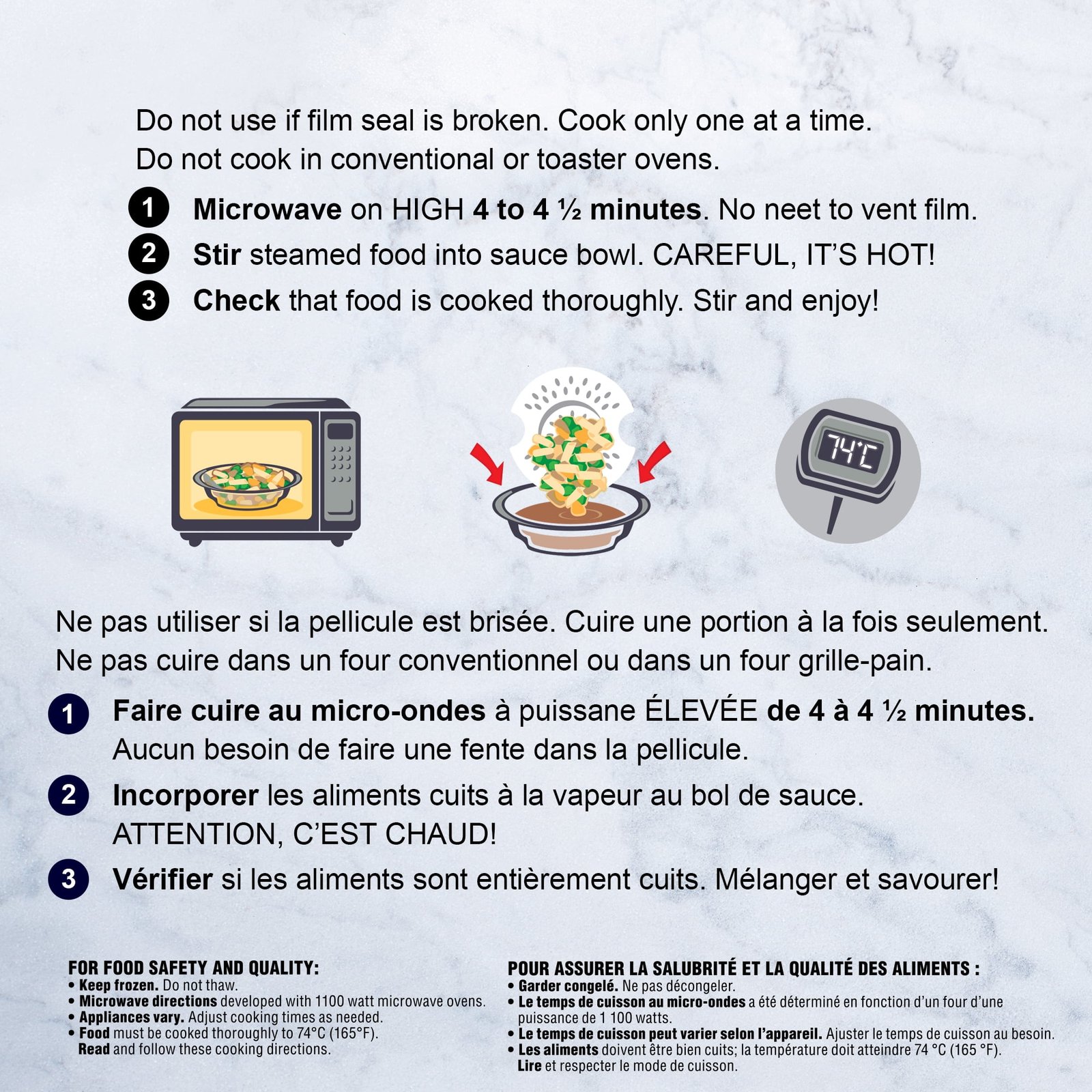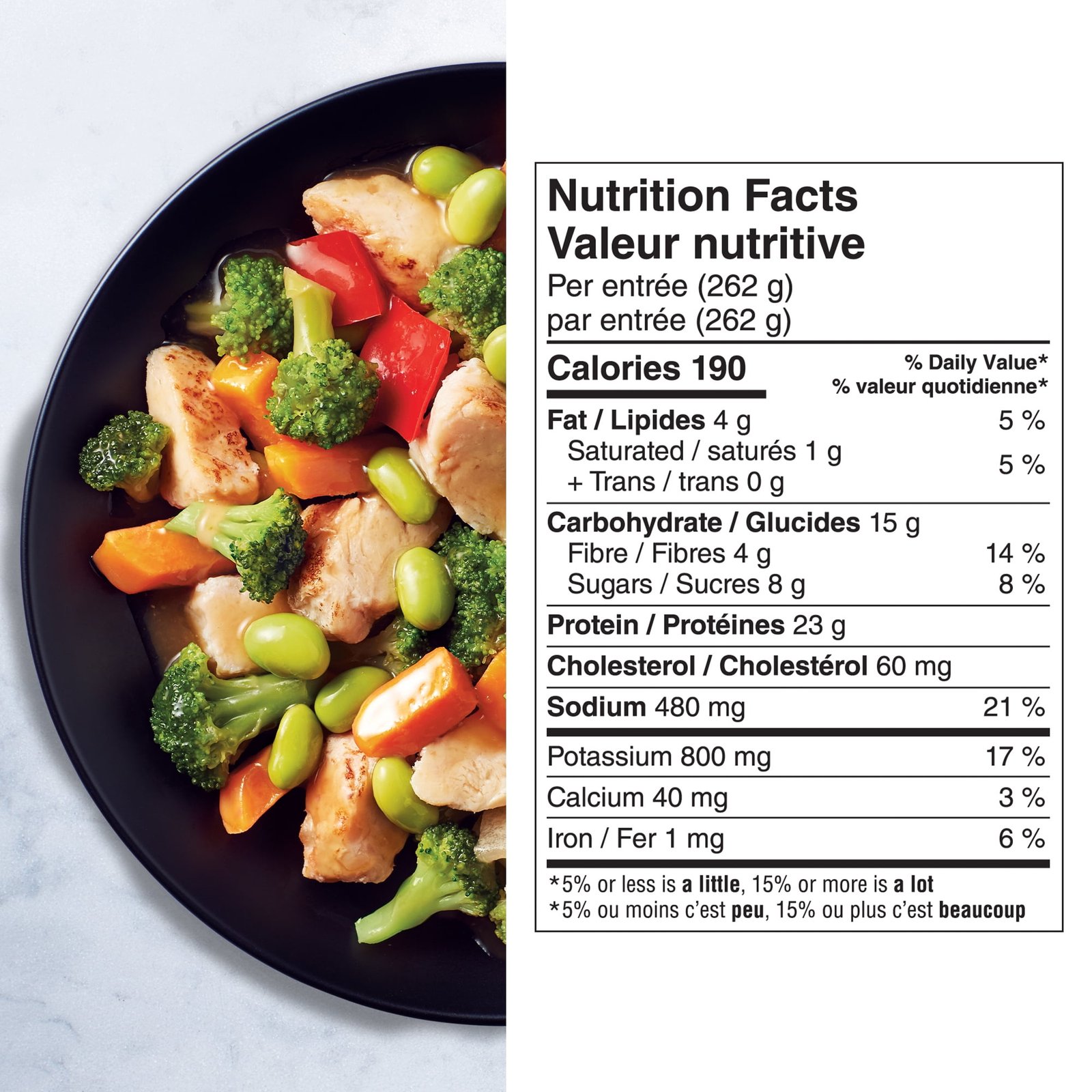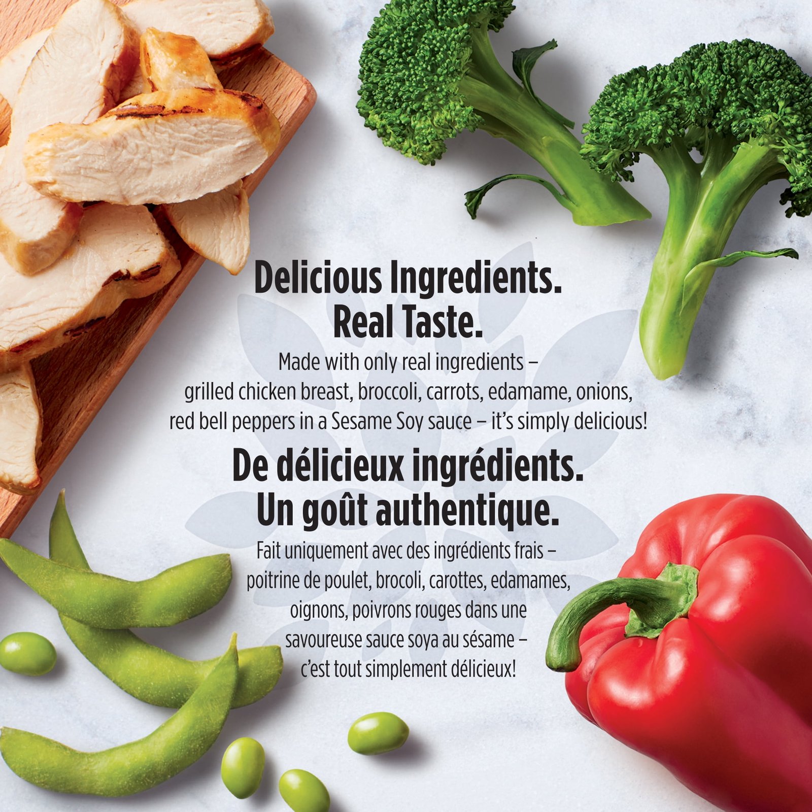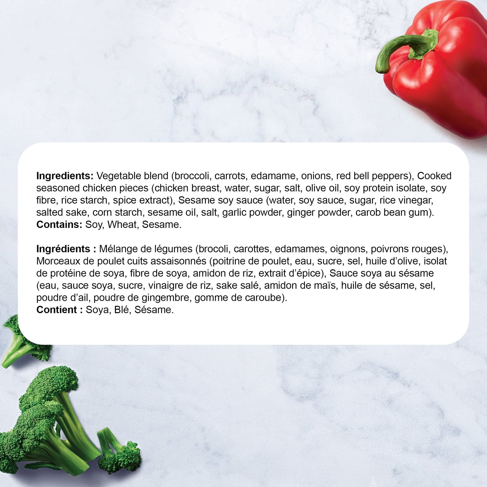 | Ingredients | VEGETABLES (BROCCOLI. CARROTS. EDAMAME. ONIONS. RED PEPPERS). COOKED SEASONED CHICKEN PIECES (CHICKEN BREAST. WATER. SEA SALT. SUGAR. OLIVE OIL. SOY PROTEIN ISOLATE PRODUCT [ISOLATED SOY PROTEIN. SOY FIBRE. RICE STARCH]. NATURAL FLAVOUR). SESAME SAUCE (WATER. SOY SAUCE [WATER. WHEAT. SOYBEANS. SALT. ALCOHOL. VINEGAR. LACTIC ACID ]. SUGAR. RICE VINEGAR. SALTED SAKE. CORN STARCH. GARLIC PUREE. SESAME OIL. GINGER PUREE. LOCUST BEAN GUM). |