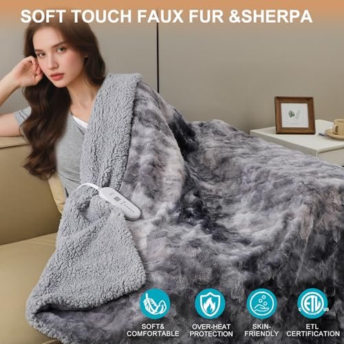 Heated Blanket Full Size.Fast Heating Soft Faux Fur Electric Blankets 72×84.5 Heat Settings & 10 Hrs Auto Off.Machine Washable.Over-Heat Protection (Grey)