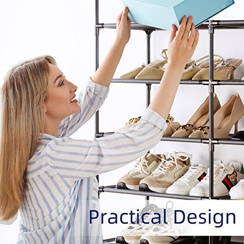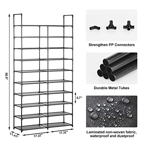 - △PRACTICAL DESIGN: This 10-tier shoe rack organizer is designed with a double-row structure. with three additional steel pipes in the middle of each layer for support. which greatly improves the product’s load-bearing capacity and overall structural stability. At the same time. this shoe rack can also use part of the accessories assembled into a single row to adapt to narrow spaces.