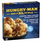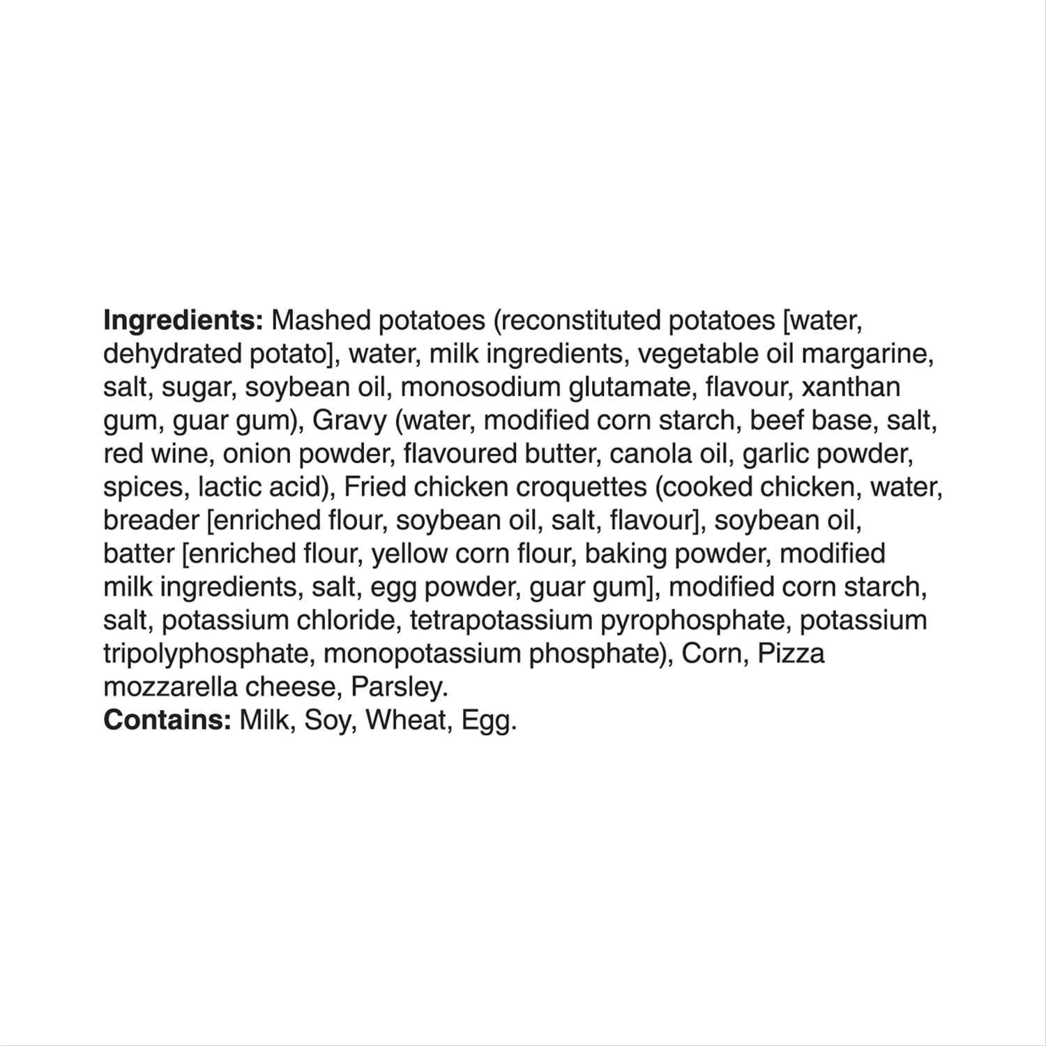 | Ingredients | Ingredients: Mashed potatoes (reconstituted potatoes [water. dehydrated potato]. water. cream. vegetable oil margarine. salt. sugar. soybean oil. skim milk powder. monosodium glutamate. flavour. xanthan gum. guar gum). Gravy (water. modified corn starch. onions. beef base [cooked beef. yeast extract. beef tallow. beef extract. natural flavour. salt. sugar. vegetable juice concentrate. lactic acid]. red wine. butter. salt. canola oil. garlic. spices). Fried chicken croquettes (cooked chicken. water. breader [enriched flour. soybean oil. salt. flavour]. soybean oil. batter [enriched wheat flour. yellow corn flour. baking powder. modified milk ingredients. salt. egg powder. guar gum]. modified corn starch. salt. potassium chloride. tetra potassium pyrophosphate. potassium tripolyphosphate. monopotassium phosphate). Corn. Pizza mozzarella cheese. Parsley. Contains: Milk. Soy. Wheat. Egg. |