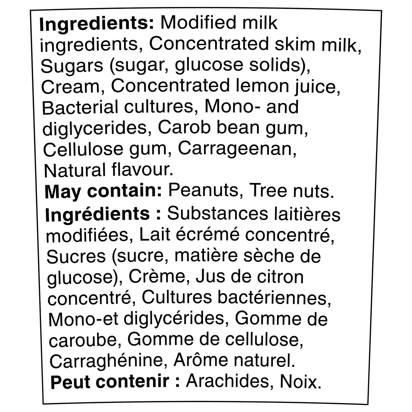 | Ingredients | Ingredients: Modified milk ingredients. Concentrated skim milk. Sugars (sugar. glucose solids). Cream. Concentrated lemon juice. Bacterial cultures. Mono- and diglycerides. Carob bean gum. Cellulose gum. Carrageenan. Natural flavour. |