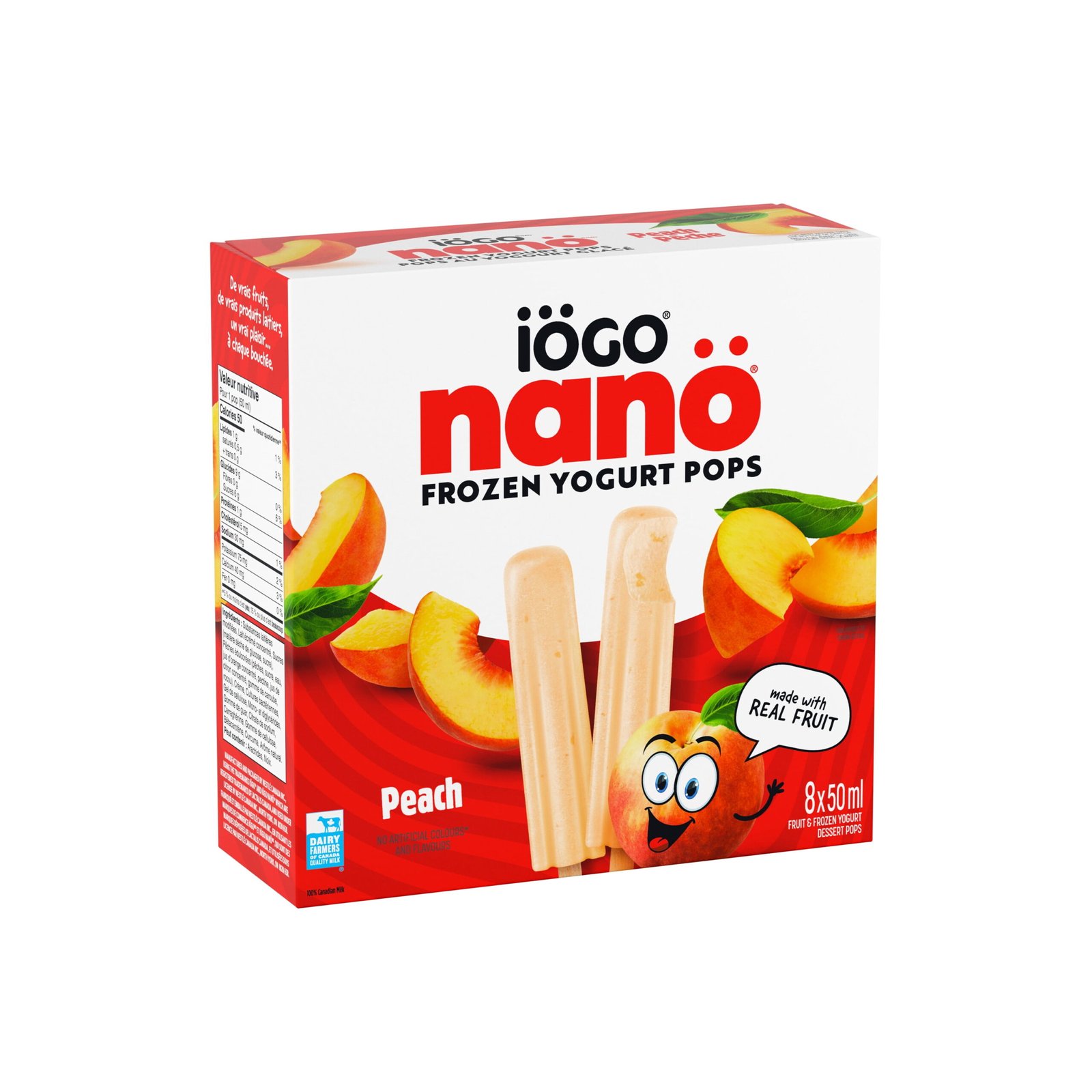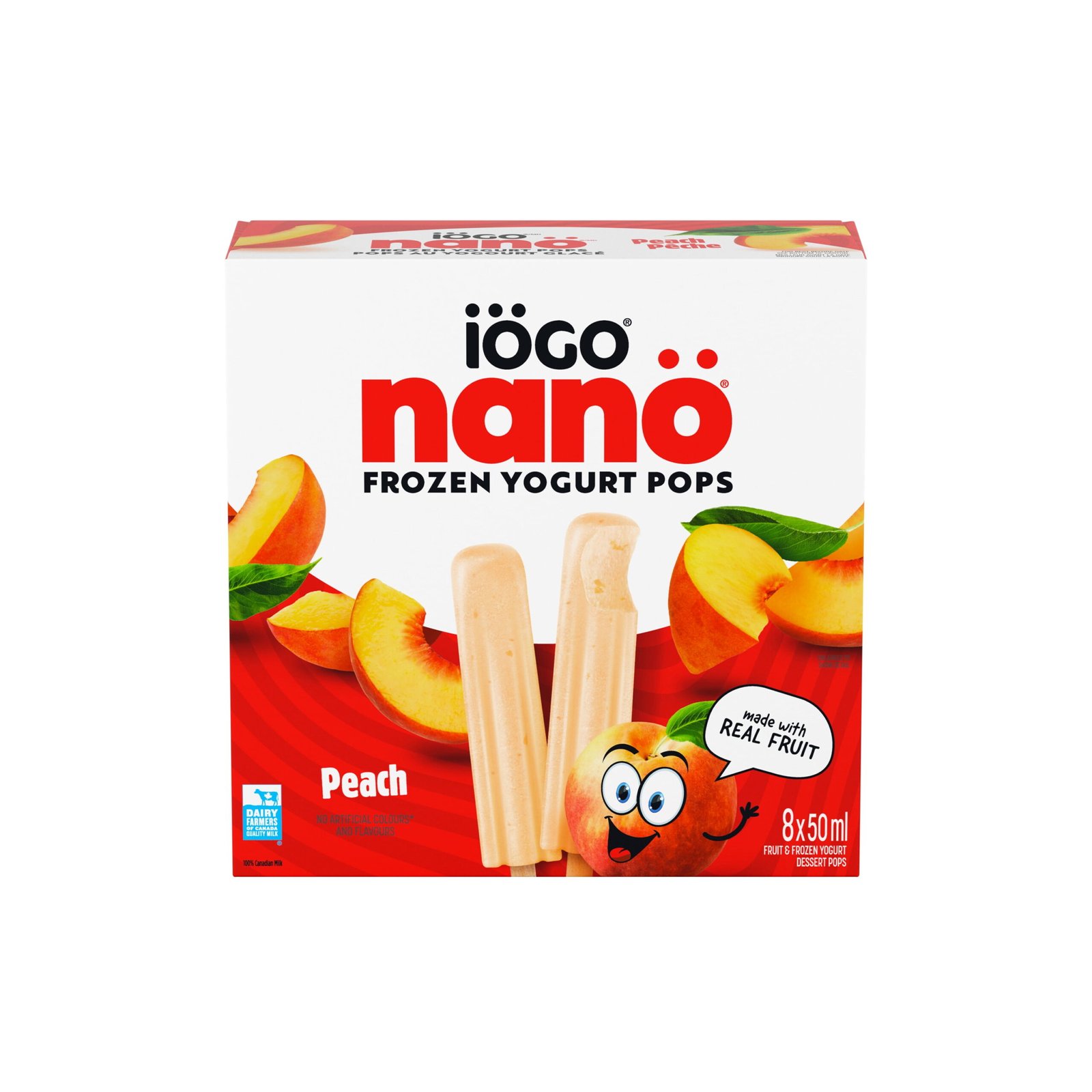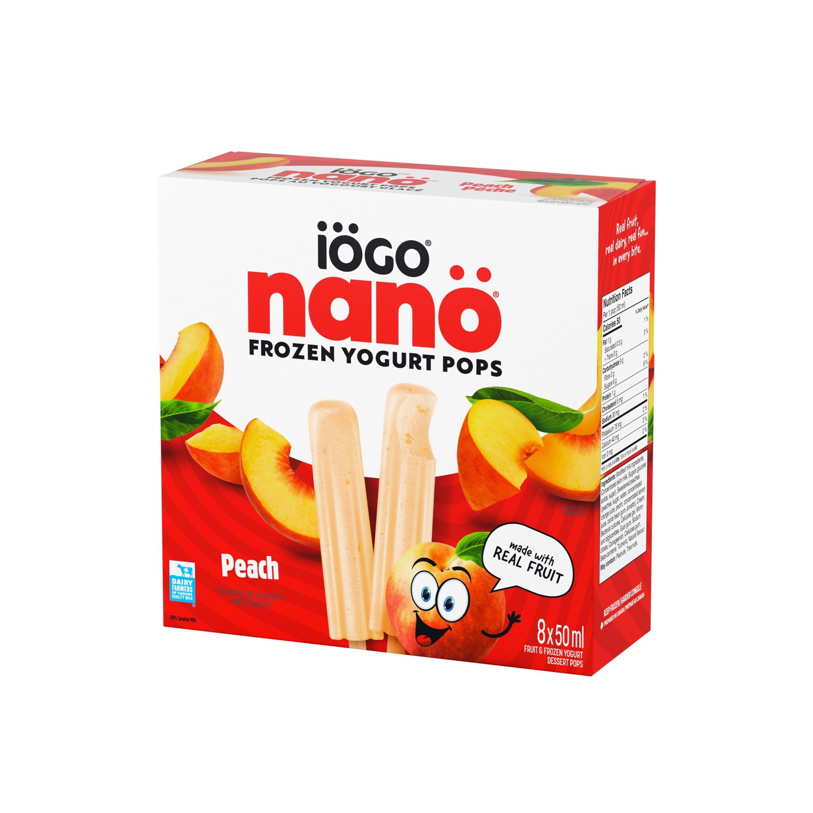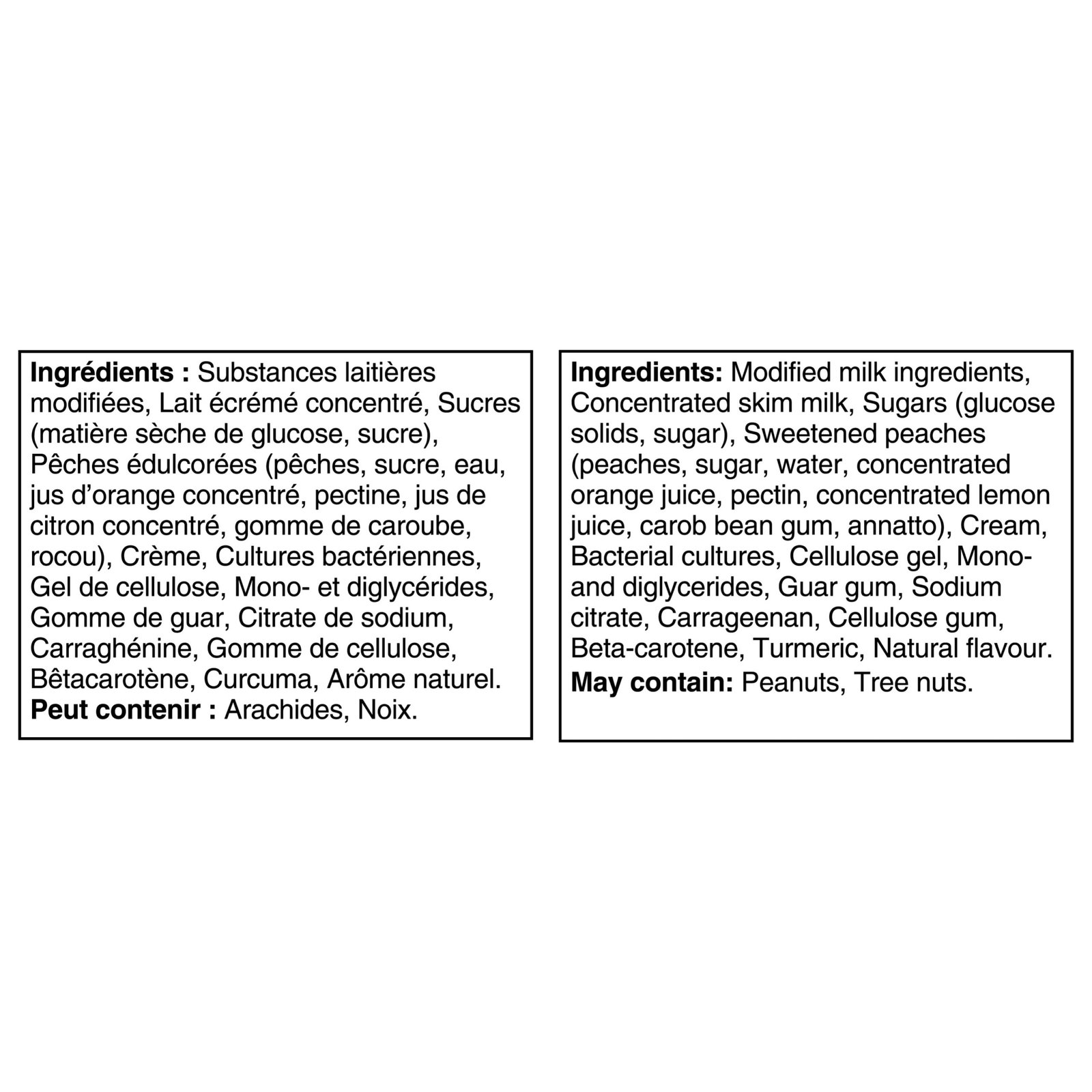 | Ingredients | Ingredients: Modified milk ingredients. Concentrated skim milk. Sugars (glucose solids. sugar). Sweetened peaches (peaches. sugar. water. concentrated orange juice. pectin. concentrated lemon juice. carob bean gum. annatto). Cream. Bacterial cultures. Cellulose gel. Mono- and diglycerides. Guar gum. Sodium citrate. Carrageenan. Cellulose gum. Beta-carotene. Turmeric. Natural flavour. |