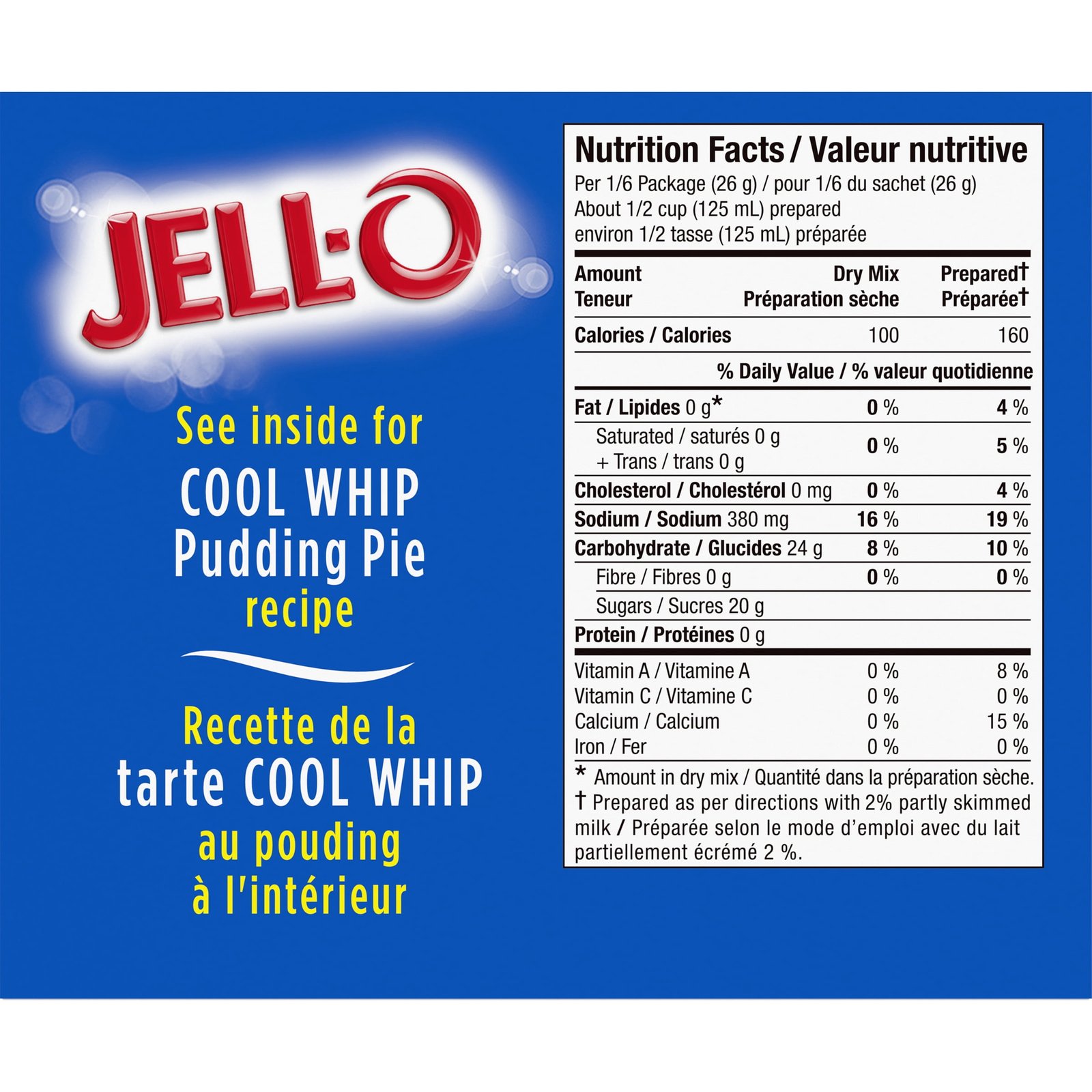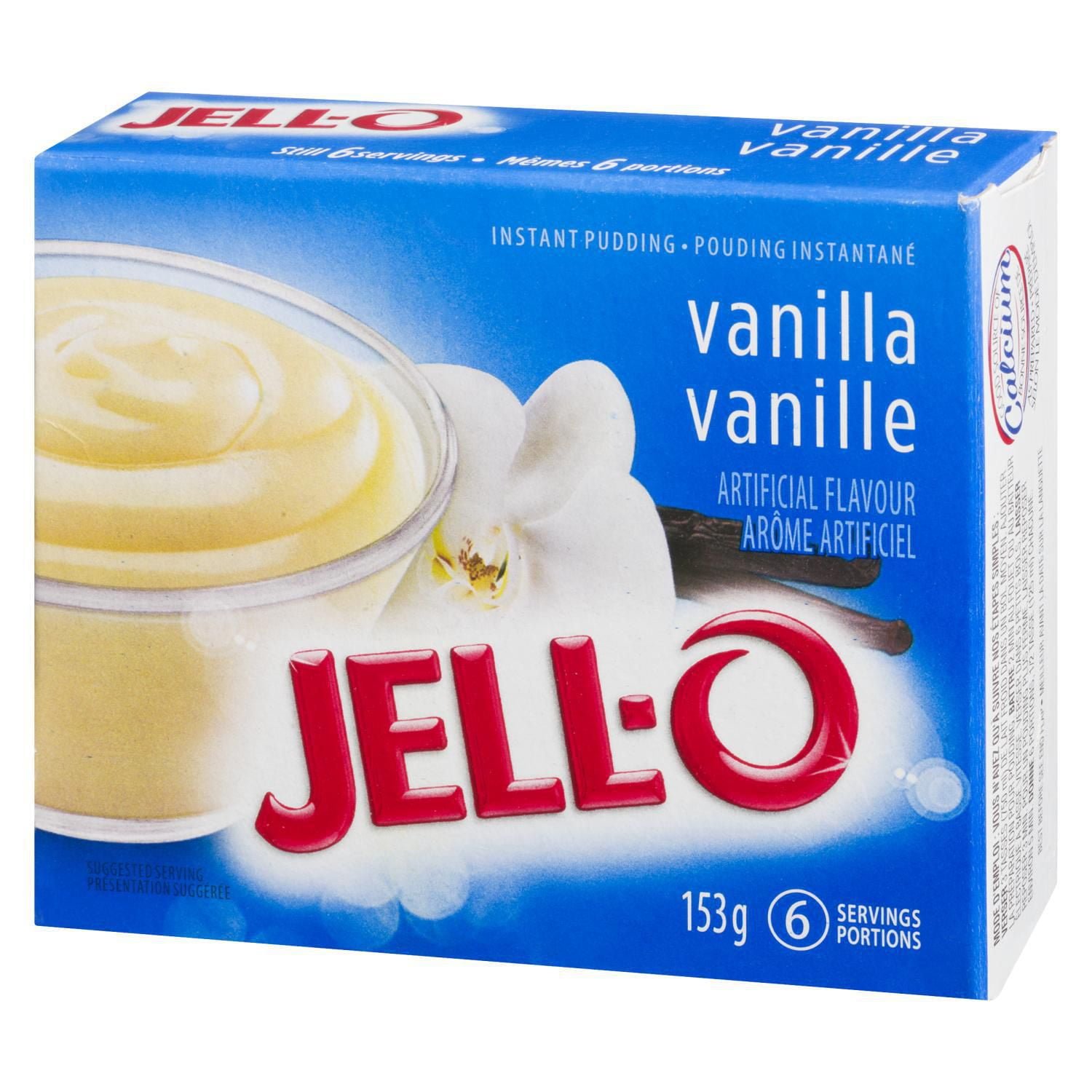 Jell-O Vanilla Instant Pudding Mix offers a delicious flavor. whether you eat it as a treat or use it as an ingredient in your favorite dessert recipes. The delicious vanilla flavor tastes great as a pie filling or as an ingredient in vanilla cake. • One 153 g. box of Jell-O Vanilla Instant Pudding Mix • Jell-O Vanilla Instant Pudding Mix tastes great alone or in desserts • Individually packaged in a sealed pouch for freshness • You will quickly have a delicious pudding that the entire family will enjoy