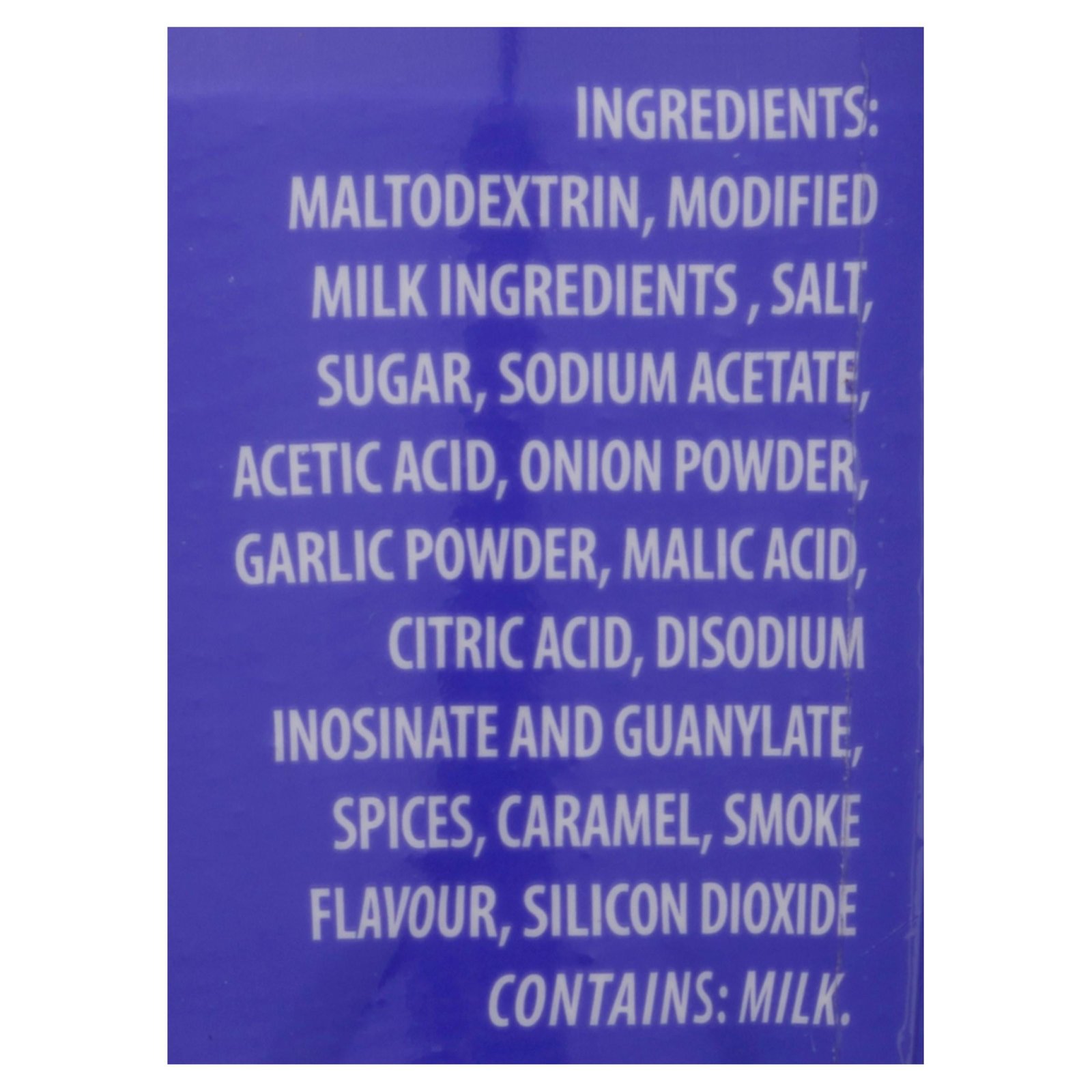 Modified milk ingredients. corn maltodextrin. salt. sugar. sodium acetate. acetic acid. yeast. wheat flour. onion powder. garlic powder. malic acid. citric acid. disodium inosinate. disodium guanylate. spices. caramel colour. smoke flavour. silicon dioxide.
