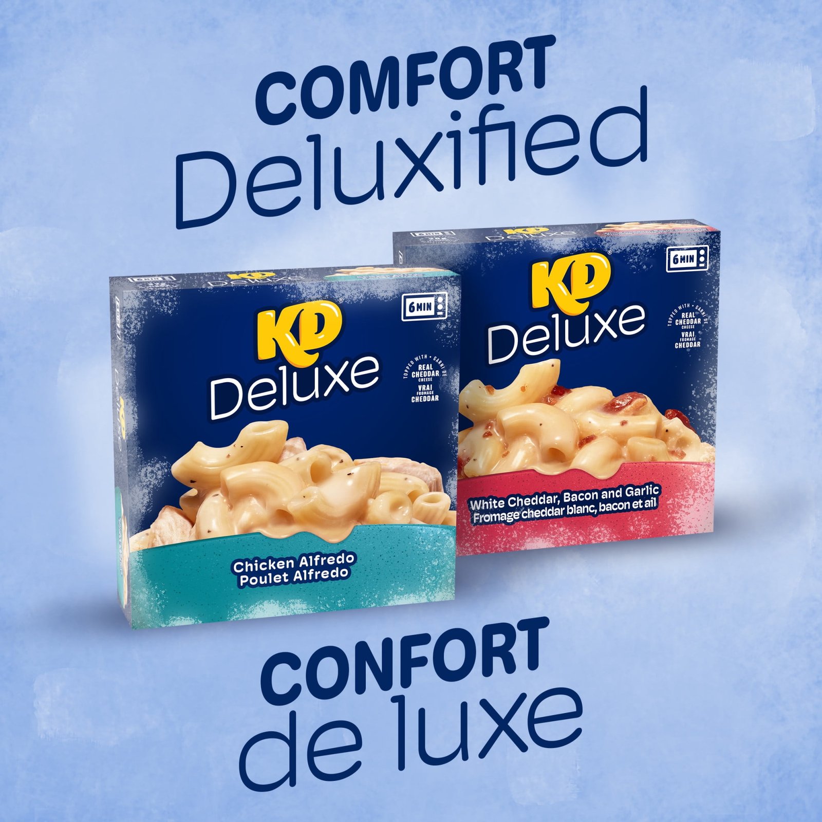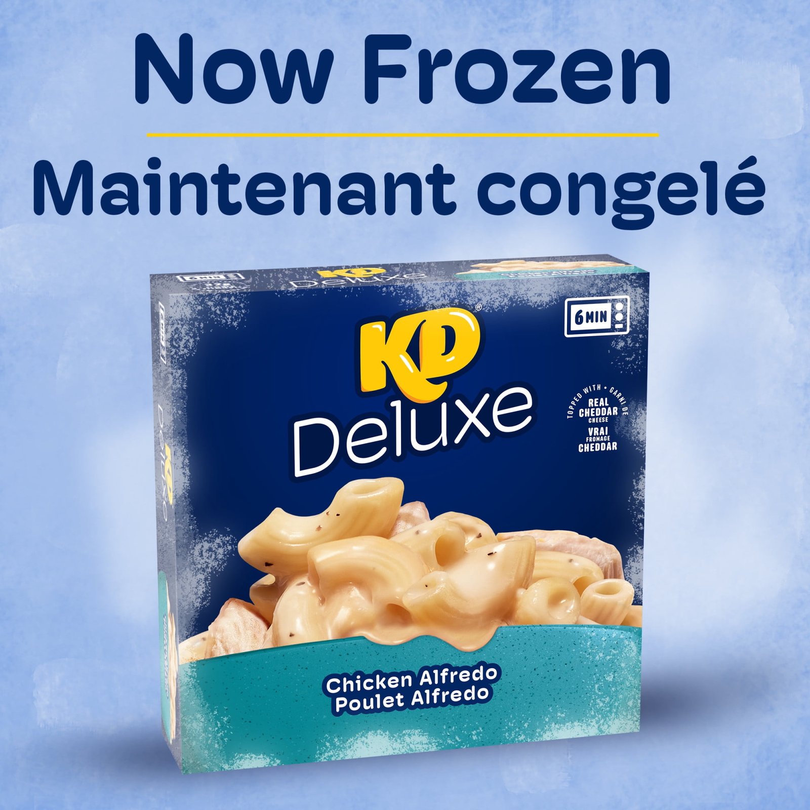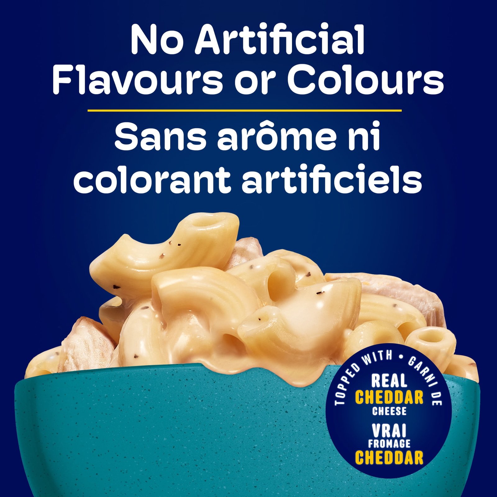 | Ingredients | Cheese sauce (water. cheddar. part skim pizza mozzarella. parmesan. asiago. and romano cheeses [milk. modified milk ingredients. salt. bacterial culture. powdered cellulose. microbial enzymes]. modified milk ingredients. soybean oil. tapioca starch. butter. garlic. sodium phosphates. salt. xanthan gum. spices. microbial enzymes. natural flavour. bacterial culture. locust bean gum). Cooked pasta (wheat flour. water. wheat gluten. carrageenan). Cooked seasoned chicken pieces (chicken breast meat with rib meat. water. sea salt. rice starch. spices. chicken stock. torula yeast. evaporated cane syrup. garlic. onion). |
