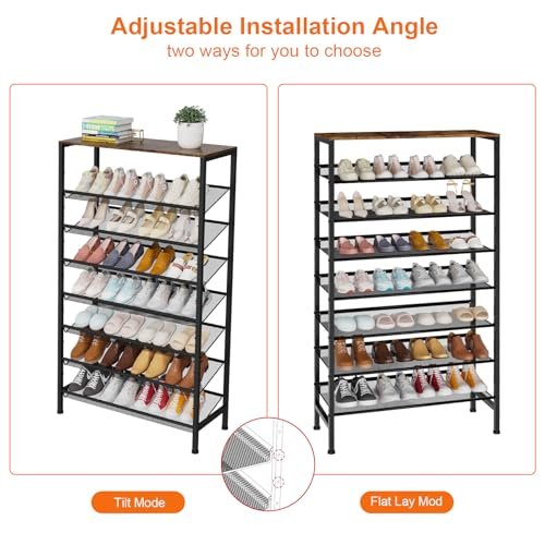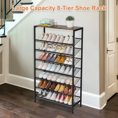 Large Shoe Rack 8 Tier Shoe Organizer. Heavy Duty Metal Shoe Storage Vertical Shoe Rack for Closet Front Door Entrance. Up to 28 Pairs. Top Wooden Storage Shelf. Black