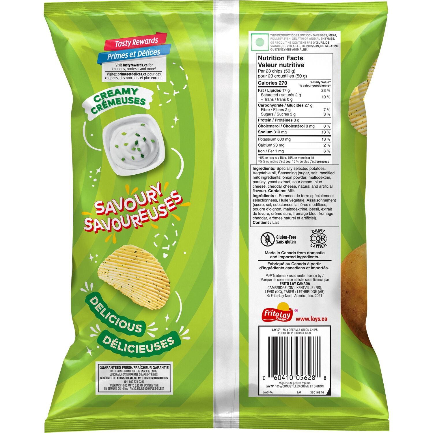 Snack time just isn’t complete without the timeless taste of Lay’s® potato chips! With many flavours to choose from. Canadians have been enjoying Lay’s® products for many years. It all starts with quality potatoes. Simple. wholesome and real’ so you get that perfect. crispy chip every time you reach for Lay’s®. Welcome to Canada. Lay’s® Cream & Onion – creamy. savoury and delicious ridged potato chips! Inspired by Lay’s® India’s most popular flavours. we’ve created a Cream & Onion flavour of our very own for you to enjoy. Always Fun. Always Yum!A CANADIAN FAVOURITE — Lay’s potato chips have been a taste tradition in Canadian homes for many years.