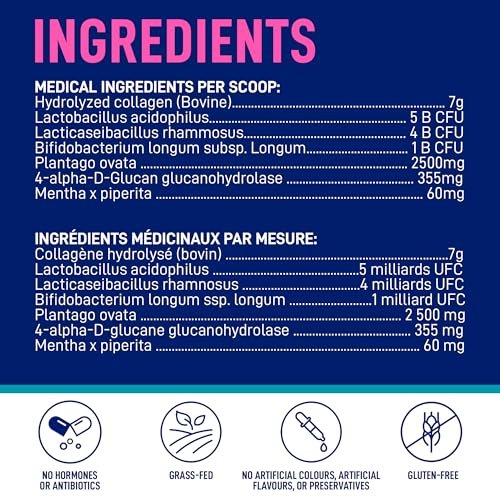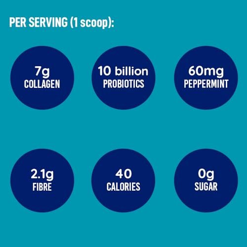 • COLLAGEN & GUT UNFLAVOURED POWDER: Each serving contains 7g of type 1 and 3 hydrolyzed collagen sourced from grass-fed bovine. along with 10 billion probiotics. 60mg peppermint. and 2.1g fibre from psyllium (plantago ovata). Zero sugar and only 40 calories per serving.