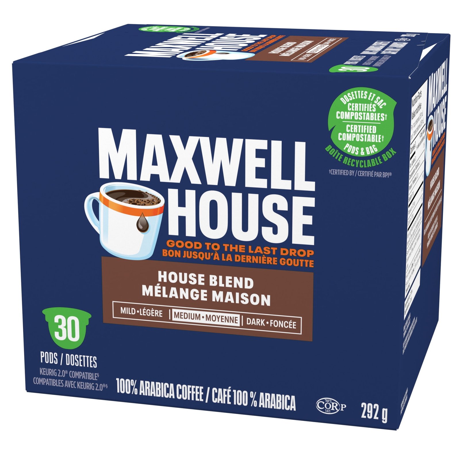 | Fabric Property | •292g of 30ct Maxwell House House Blend Coffee 100% Compostable Pods•Made with 100% Arabica beans•100% pure ground coffee•Pods and bag are 100% compostable and our box is recyclable•Good to the last drop |