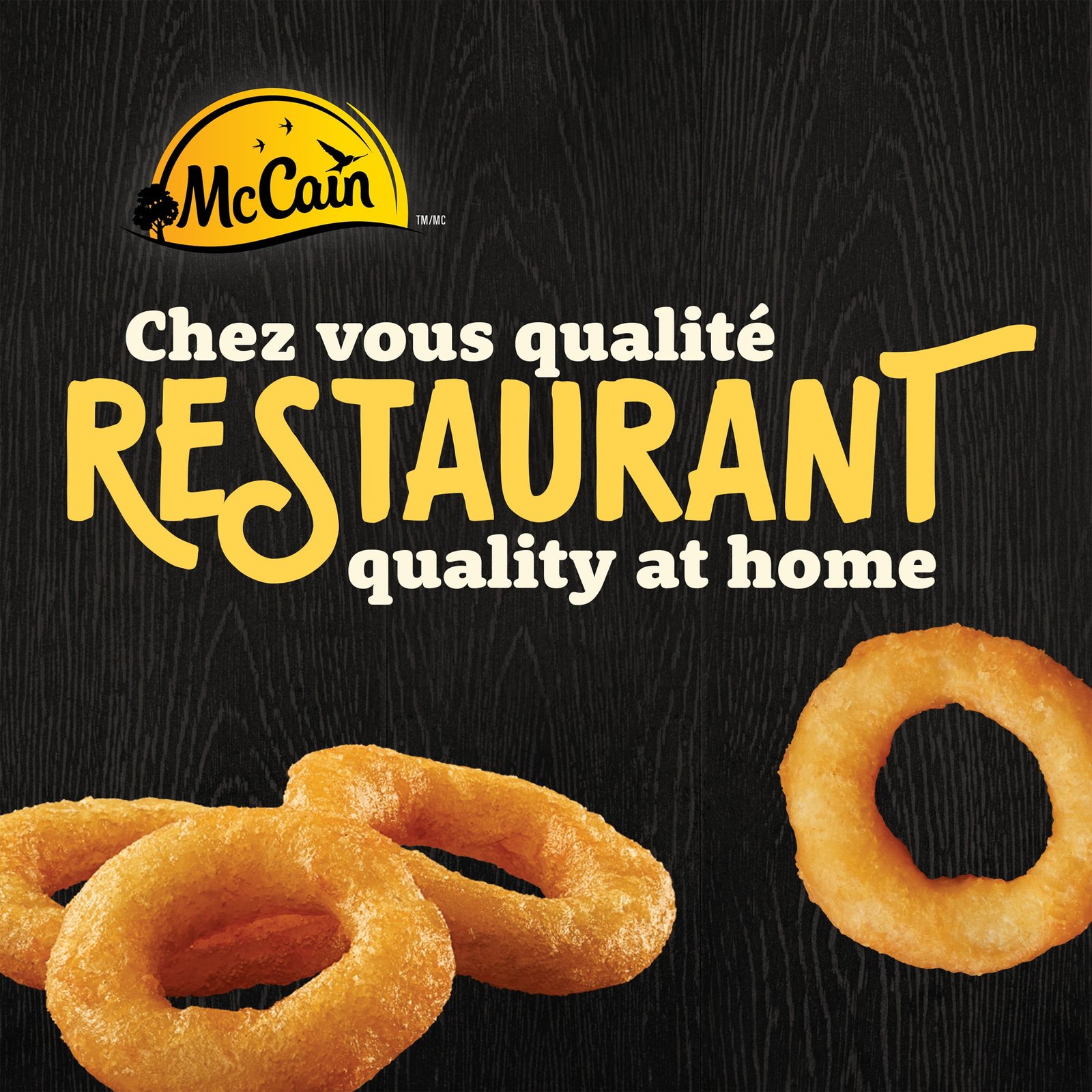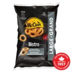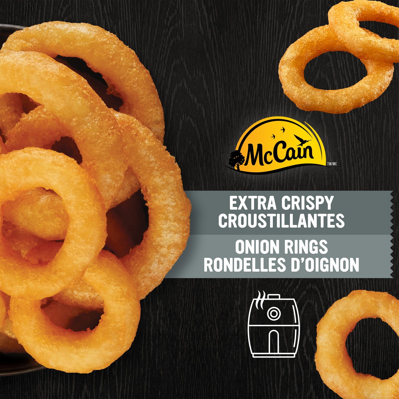 Enjoy restaurant quality at home with new McCain® Bistro Selects Extra Crispy Onion Rings. Made with full onions that are sliced and battered to perfection in a delicious crisp coating. These onion rings make an elevated side for lunches and dinners. or shareable snack and party food. Bistro Onion Rings are family approved and are made with real ingredients and no preservatives. Keep this generous 1.2kg large bag on hand for a quick and easy side the whole family will enjoy. Cook McCain Bistro extra crispy onion rings in the airfryer for 14 minutes or in the oven for 15-18 minutes. Made in Canada from domestic and imported ingredients. COOKING INSTRUCTIONS: Air fryer – preheat to 375°F (191°C). fill basket halfway. air fry for 12-14 minutes. sliding out basket and shaking onion rings halfway through. Oven – preheat to 425°F (218°C). spread frozen rings in a single layer on a baking sheet and bake for 15-18 minutes. turning halfway through. See full details on packaging.