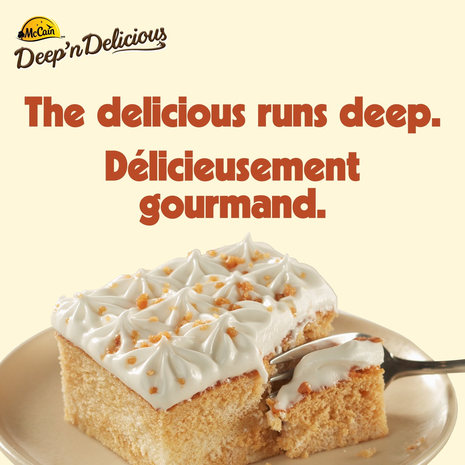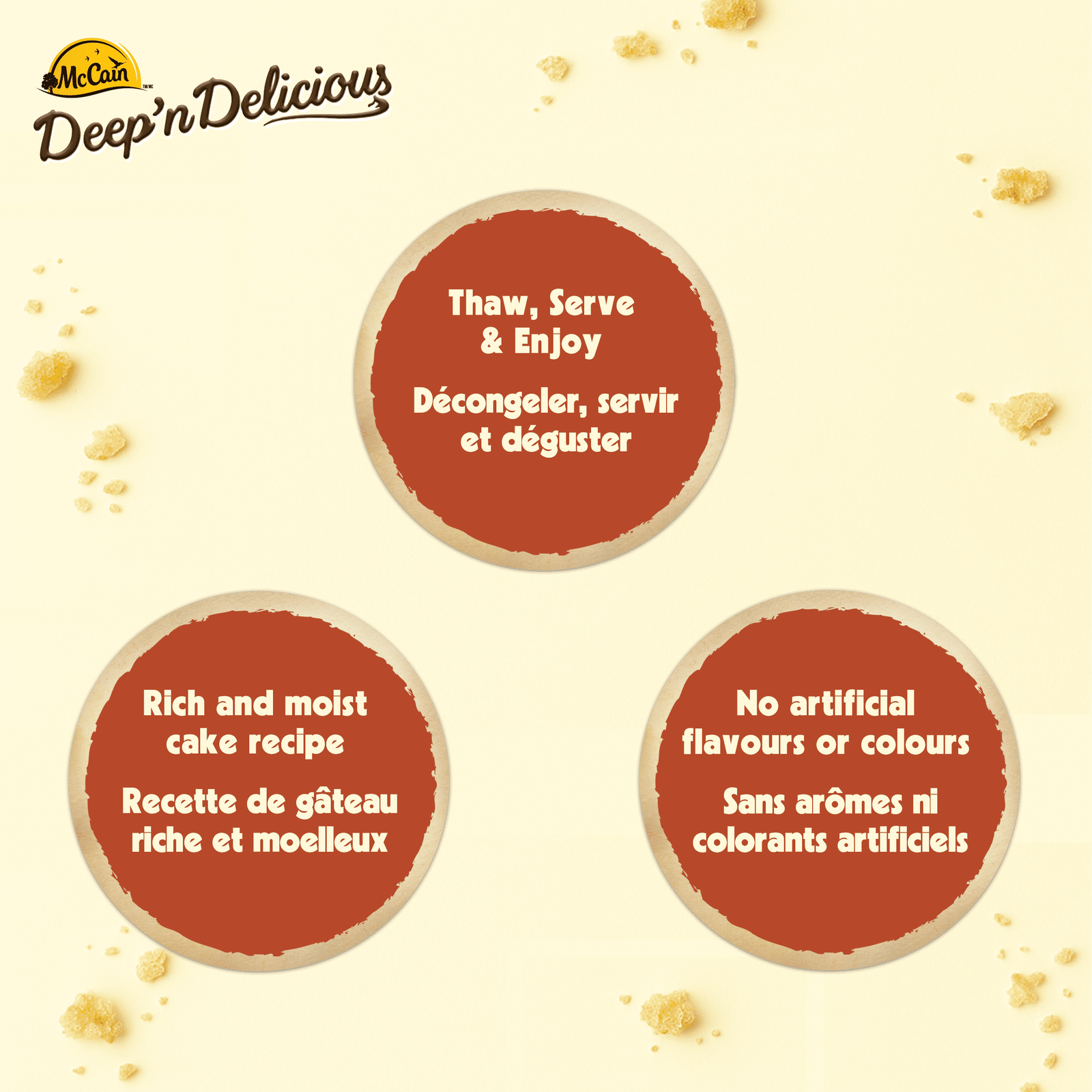 McCain® Deep’n Delicious® Salted Caramel Cake is a frozen cake with a sophisticated sweet-and-salty flavour profile. Our moist and fluffy caramel flavoured cake. smooth and creamy Deep’n Delicious® vanilla icing. and delightful salted caramel crumb topping instantly transforms any dessert into a special occasion. This ready-to-eat caramel cake is an easy option for entertaining. family gatherings. or whenever you want to enjoy a satisfying sweet treat. Simply thaw. cut and serve. For colder cake. thaw 5-10 minutes. For a softer cake. thaw for up to 20 minutes. This delicious frozen dessert cake is an indulgent treat as is but can also be topped with fruit and more when you want to get creative. Made in Canada from domestic and imported ingredients. COOKING INSTRUCTIONS: Do not heat or bake. Just cut and serve. For a softer cake. thaw for up to 20 minutes.