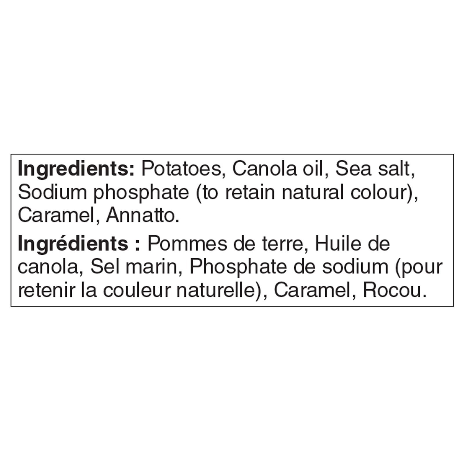 | Ingredients | Potatoes. Canola oil. Sea salt. Sodium phosphate (to retain natural colour). Caramel. Annatto. |